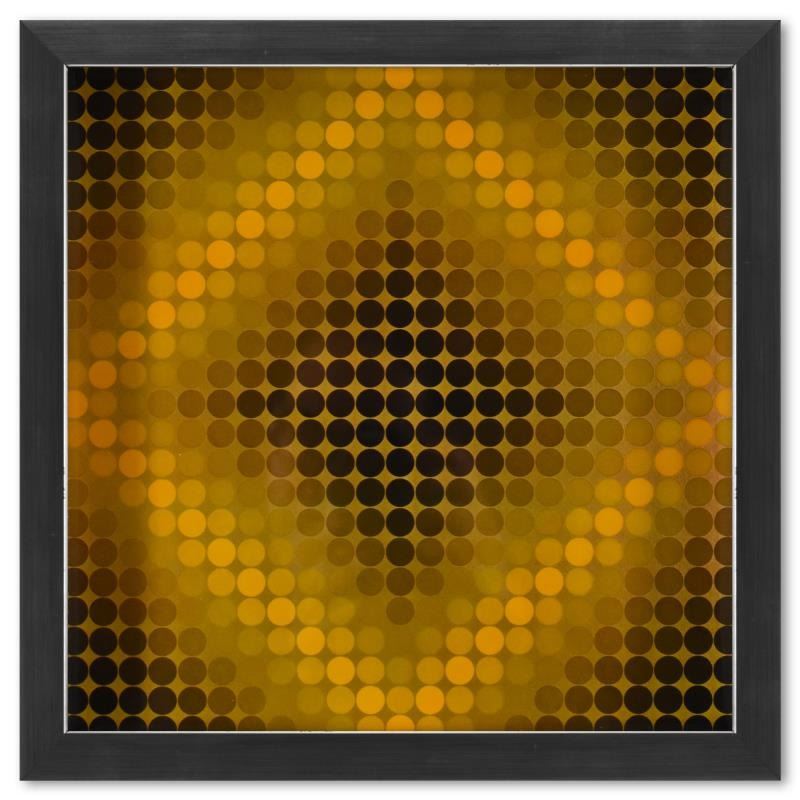 "DIA - SP - F1 de la série CTA - 102" is a heliogravure print on paper, published in 1971, by Victor Vasarely (1908-1997). This piece comes custom framed, with a letter of authenticity and with a 1976 Vasarely paperback. Measures approx. 11.5" x 11.5" (frame), 9" x 9" (image).