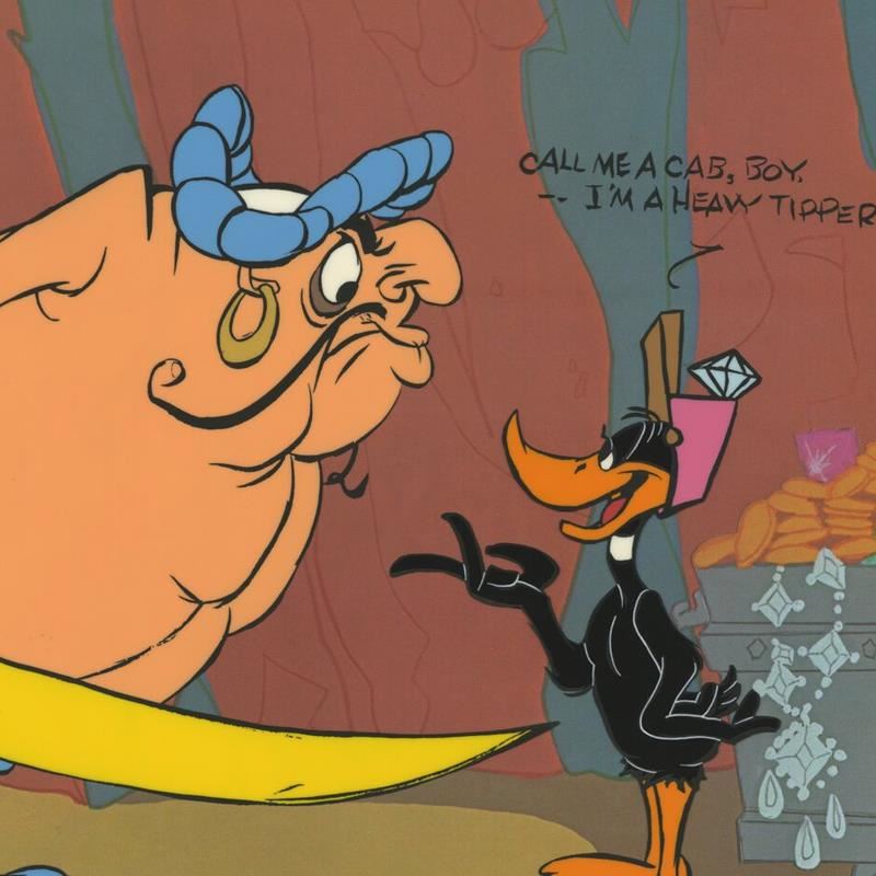 "Daffy And Hassan: Call Me A Cab" is a limited edition animation cel with hand painted coloring on sericel outline. The piece is numbered, hand signed by Chuck Jones (1912-2002), and includes a Certificate of Authenticity! Measures Approx: 16.5" x 13.5"