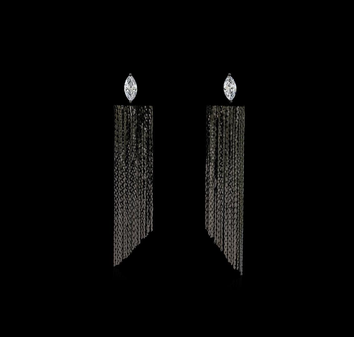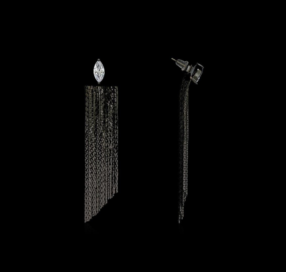 High end designer jewelry. Dangle Crystal Teardrop Earrings - Black Rhodium Plated. Blk Rhodium Plated Post Set. Gunmetal/ Cle. 3inches.