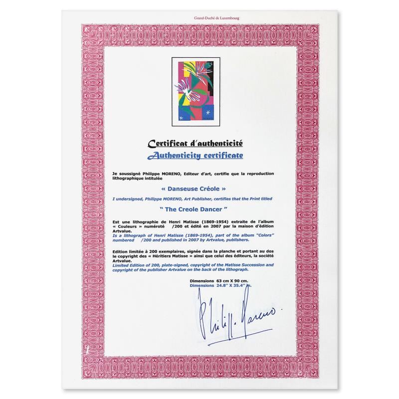 "Danseuse Creole" is a limited edition lithograph by Henri Matisse (1869-1954), bearing the plate signature of the artist. This piece comes from an edition of 200 authorized by the Matisse Estate; the edition number is not on the piece itself but on the certificate. This piece comes custom framed. Includes Certificate of Authenticity. Measures approx. 31" x 41.5" (frame), 25" x 35.5" (image).