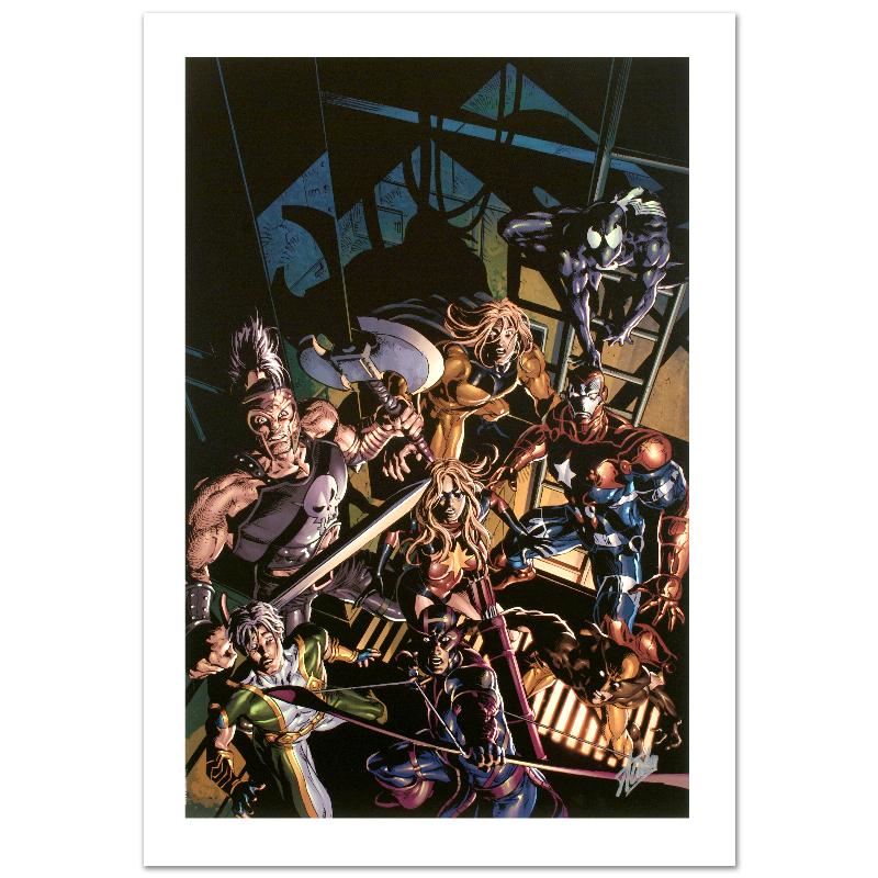 A piece of comic book history, this limited edition, from original art by Mike Deodato Jr., depicts dark avengers Hawkeye, Wolverine, Ms. Marvel, Ares, Sentry, Spider-Man, Marvel Boy, and Iron Patriot. Brazilian artist Mike Deodato Jr. has become an enduring fan favorite, working in styles ranging from wildly energetic cartooning to moody photorealism. Deodato became one of the decade's most prolific and in-demand artists, including Marvel credits such as Avengers, Elektra, Incredible Hulk, Spider-Man and Thor. "Dark Avengers #10" is a limited edition giclee on canvas by Mike Deodato Jr. presented by Marvel Comics, numbered and hand signed by the great Stan Lee! Includes Certificate of Authenticity! Measures approx. 18" x 27" (image).