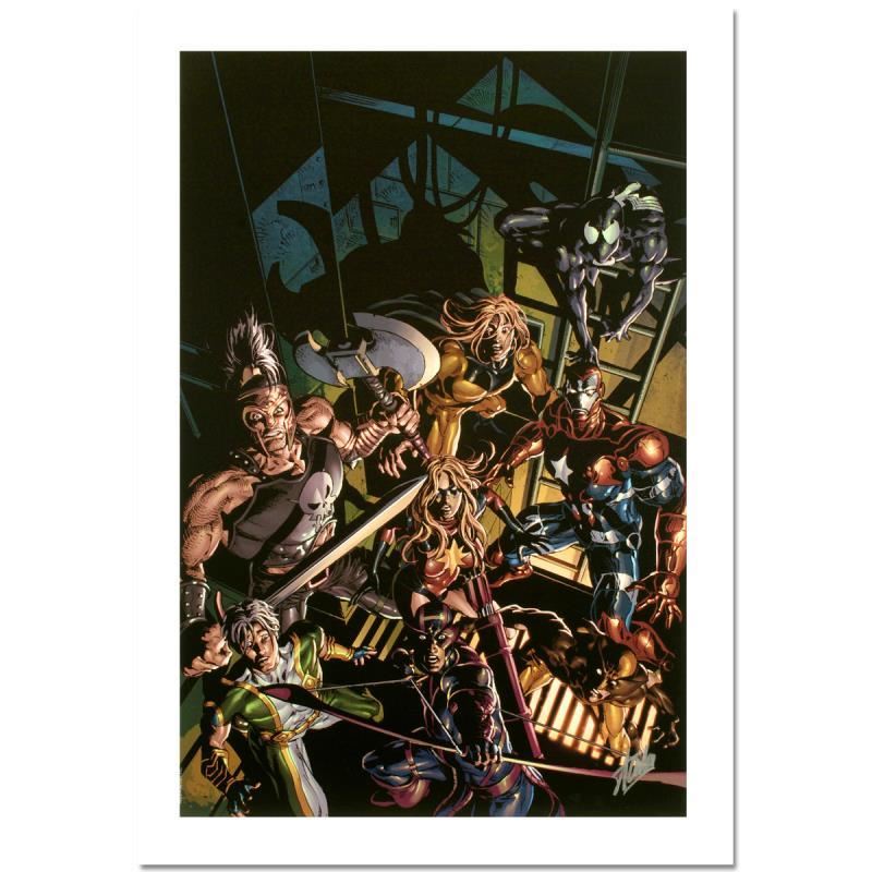 "Dark Avengers #10" is a limited edition giclee on canvas with art by Mike Deodato Jr.. Officially licensed by Marvel, this piece is numbered 1/10 and hand signed by creative legend Stan Lee (1922-2018). The piece comes with a certificate of authenticity. Please note there is a minor scratch on the left side toward the bottom in Ares' hand that could be cropped out when framed. Measures approximately 27" x 18".