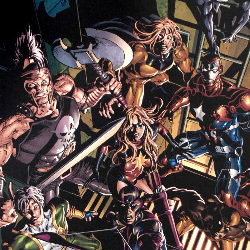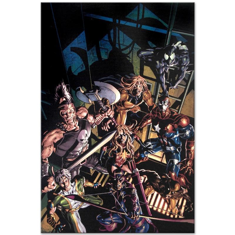 A piece of comic book history, this limited edition, from original art by Mike Deodato Jr., depicts dark avengers Hawkeye, Wolverine, Ms. Marvel, Ares, Sentry, Spider-Man, Marvel Boy, and Iron Patriot. Brazilian artist Mike Deodato Jr. has become an enduring fan favorite, working in styles ranging from wildly energetic cartooning to moody photorealism. Deodato became one of the decade's most prolific and in-demand artists, including Marvel credits such as Avengers, Elektra, Incredible Hulk, Spider-Man and Thor. "Dark Avengers #10" is a limited edition numbered giclee on canvas by Mike Deodato Jr. presented by Marvel Comics. This piece comes gallery wrapped. Includes Certificate of Authenticity! Measure approx. 18" x 27" (image).