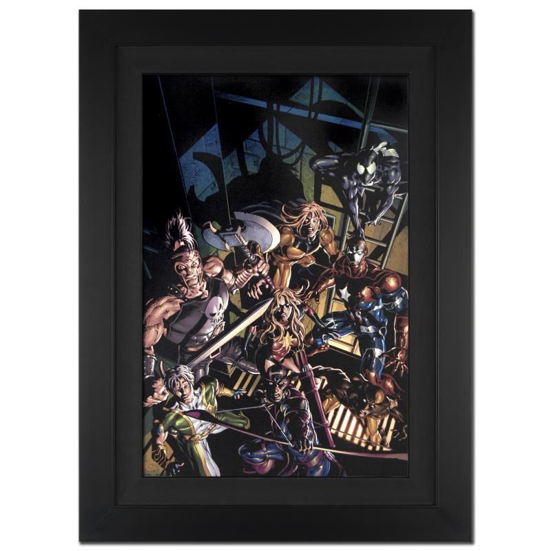 A piece of comic book history, this limited edition, from original art by Mike Deodato Jr., depicts dark avengers Hawkeye, Wolverine, Ms. Marvel, Ares, Sentry, Spider-Man, Marvel Boy, and Iron Patriot. Brazilian artist Mike Deodato Jr. has become an enduring fan favorite, working in styles ranging from wildly energetic cartooning to moody photorealism. Deodato became one of the decade's most prolific and in-demand artists, including Marvel credits such as Avengers, Elektra, Incredible Hulk, Spider-Man and Thor. "Dark Avengers #10" is an extremely limited edition giclee on canvas by Mike Deodato Jr. presented by Marvel Comics, hand signed by the great Stan Lee and numbered out of only 10! This piece comes custom framed and ready to hang. Includes Certificate of Authenticity! Measures approx. 25" x 34" (with frame), 18" x 27" (image).