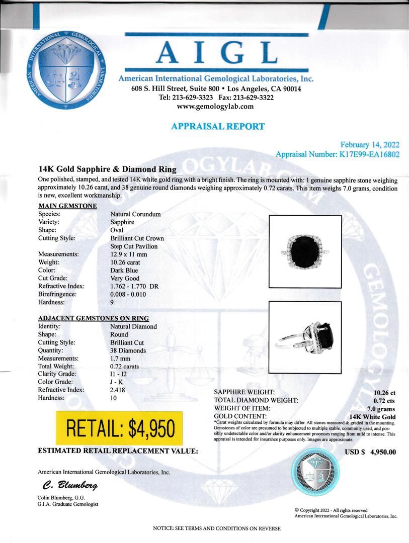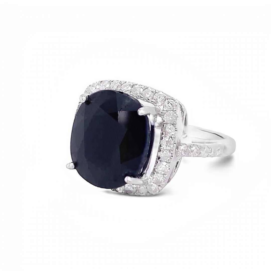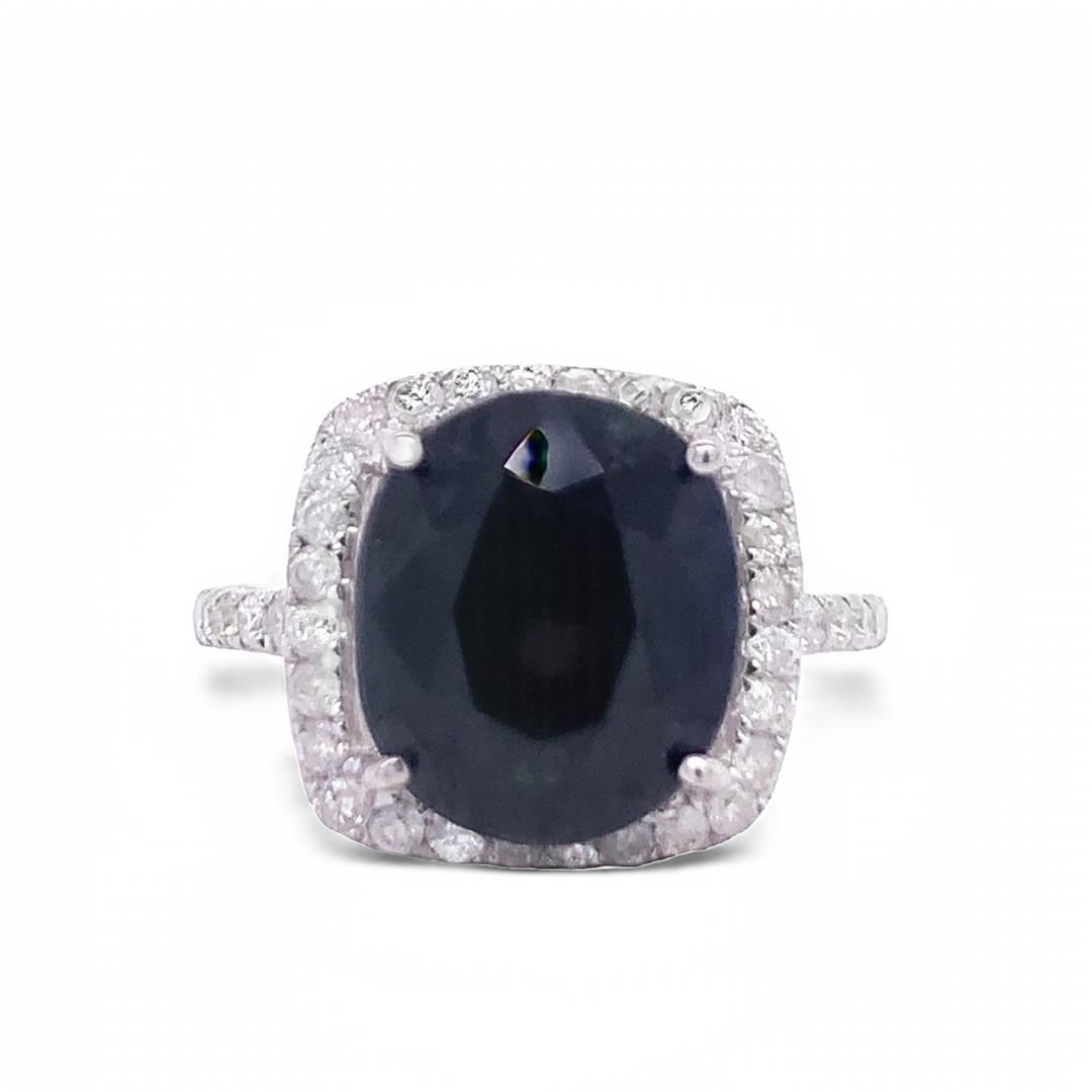 Dark Green Sapphire Ring. Please see Photos and Description for all available information. This stunning ring features a 10.26 dark green sapphire as the center stone, surrounded by a halo of round diamonds totaling 0.72ct. This ring is bold and beautiful and will last as long as your love does.