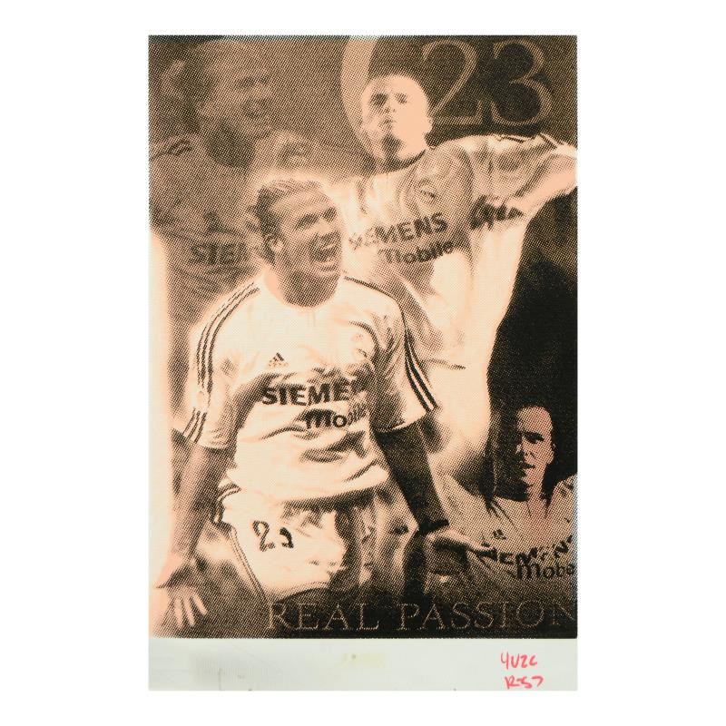 "David Beckham Pop Stamp" is a one-of-a-kind hand-pulled silkscreen on canvas by Ringo (Daniel Funes) - protege of Andy Warhol's apprentice, Steve Kaufman. This piece is hand signed by the artist and Includes Certificate of Authenticity. This piece comes from the Andy Warhol Legacy Series. Measures approx. 12" x 16" (image). ** Please note: the signature for this piece is located on the bottom-edge of the canvas and will only be visible if the piece is matted flat when framed; see photo for reference. **