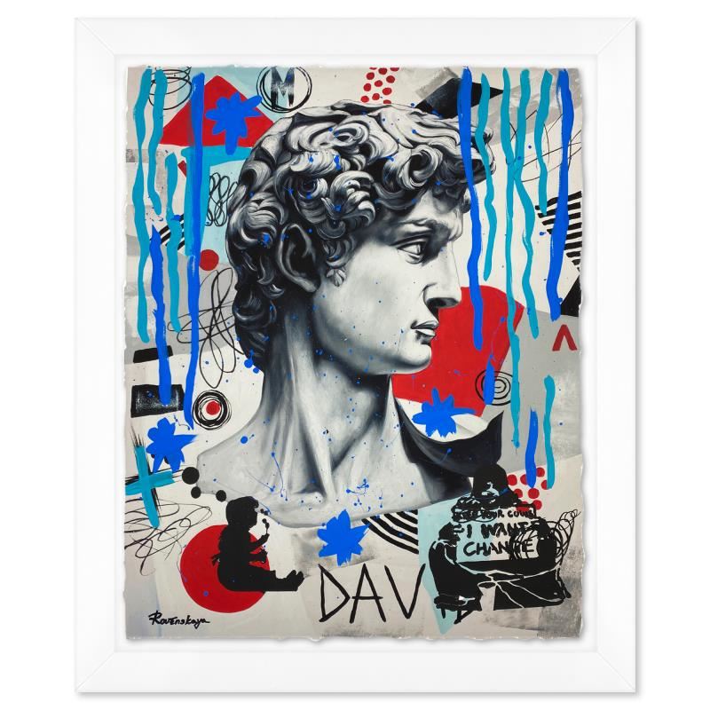 David By Rovenskaya Original. "David" is a one-of-a-kind mixed media on deckle edge paper by Nastya Rovenskaya, Hand signed by the artist. This piece comes floating in a custom frame. Includes Letter of Authenticity. Measures approximately 24" x 20" (framed), 20" x 16" (image).