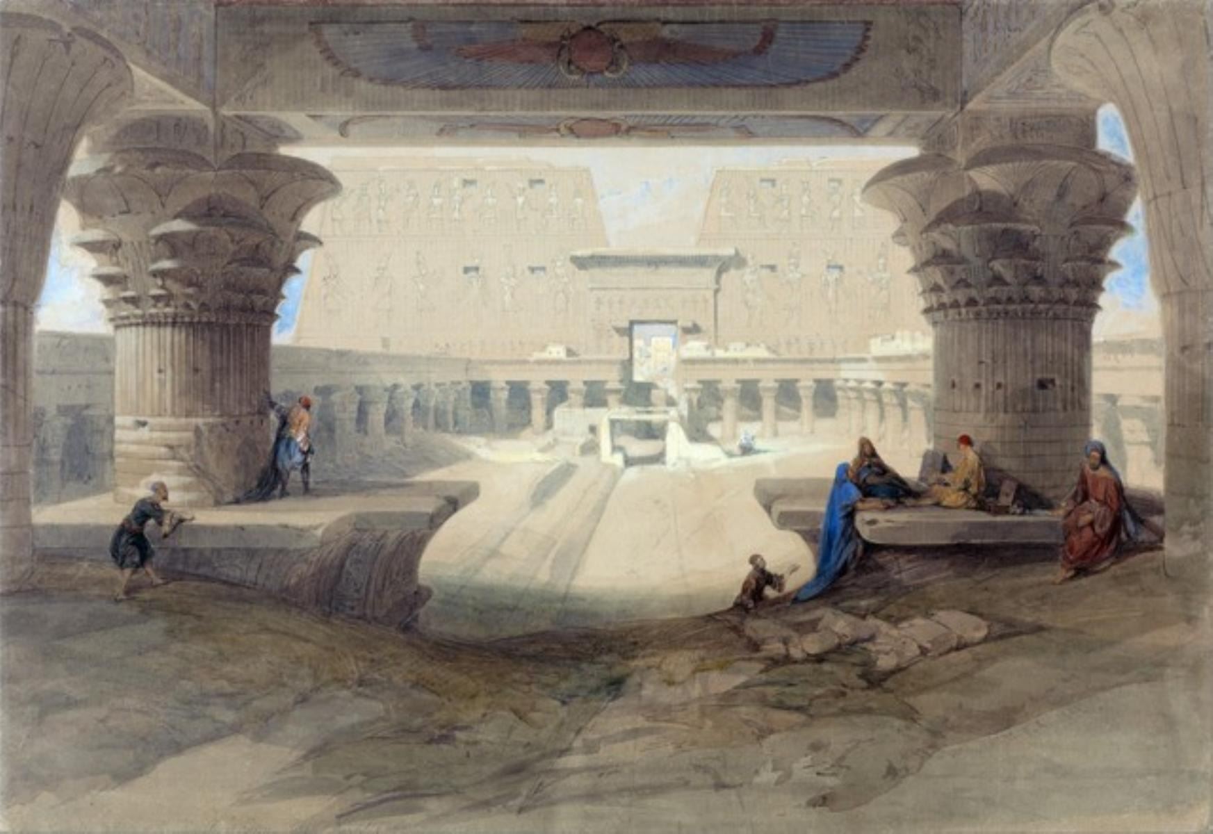 Artist: David Roberts - Title: Portico of the Temple of Edfu in Upper Egypt - Medium: Fine Art Reproduction Giclee on Canvas - Image Size: Approximately 22 inches x 32 inches - Unframed on Unstretched Canvas - Biography: David Roberts was a Scottish painter. He is especially known for The Holy Land, Syria, Idumea, Arabia, Egypt, and Nubia, a prolific series of detailed lithograph prints of Egypt and the Near East that he produced from sketches he made during long tours of the region. These and his large oil paintings of similar subjects made him a prominent Orientalist painter. He was elected as a Royal Academician in 1841.