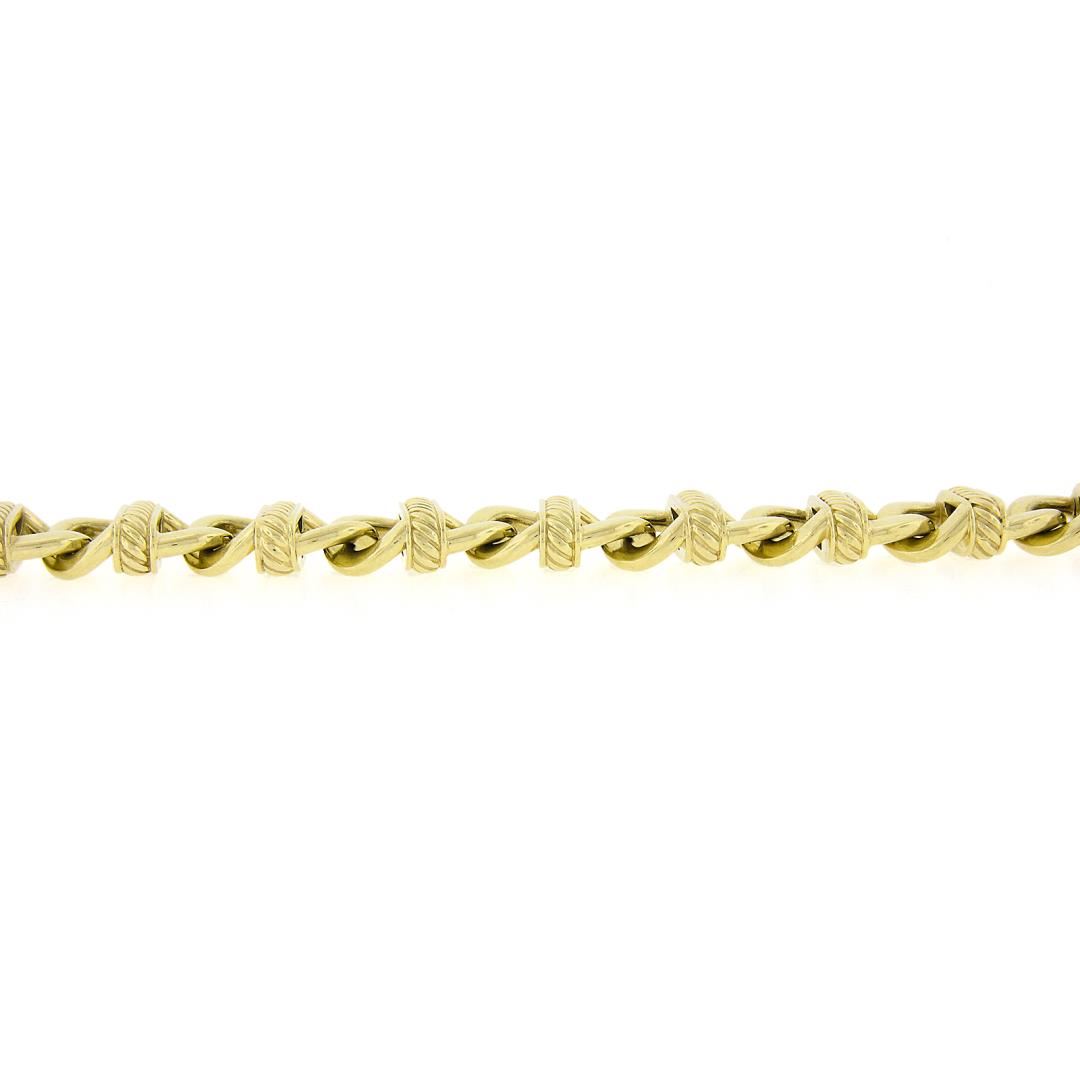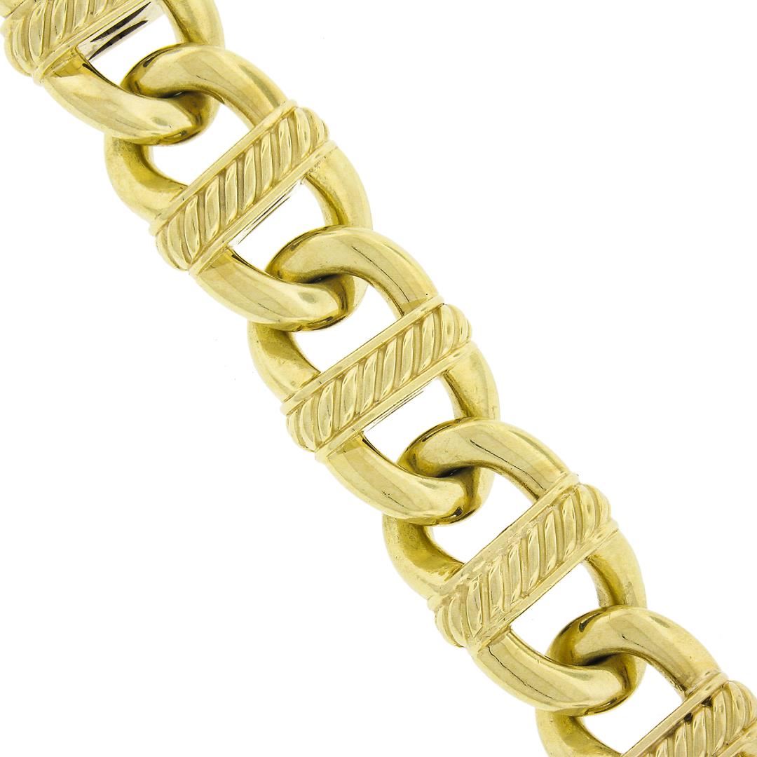 A solid 18k yellow gold link bracelet my David Yurman. It weighs a total of 55.83 grams, measures 14.4mm wide, and measures 6.5 inches in length.