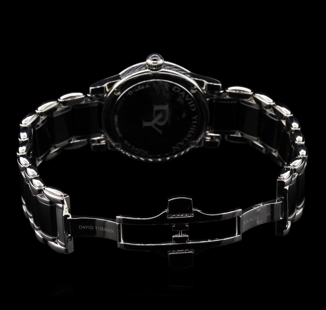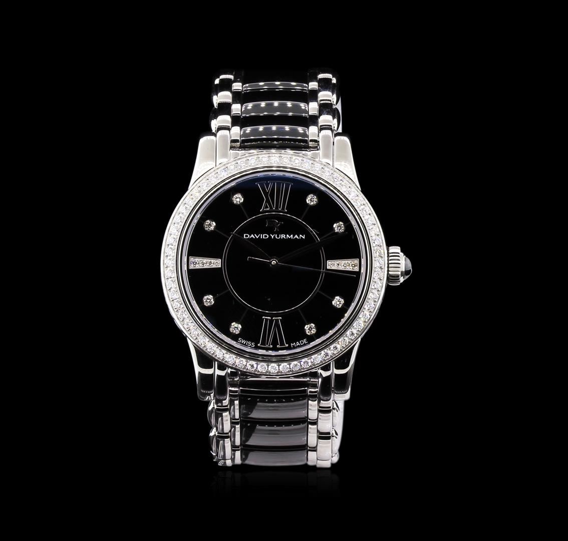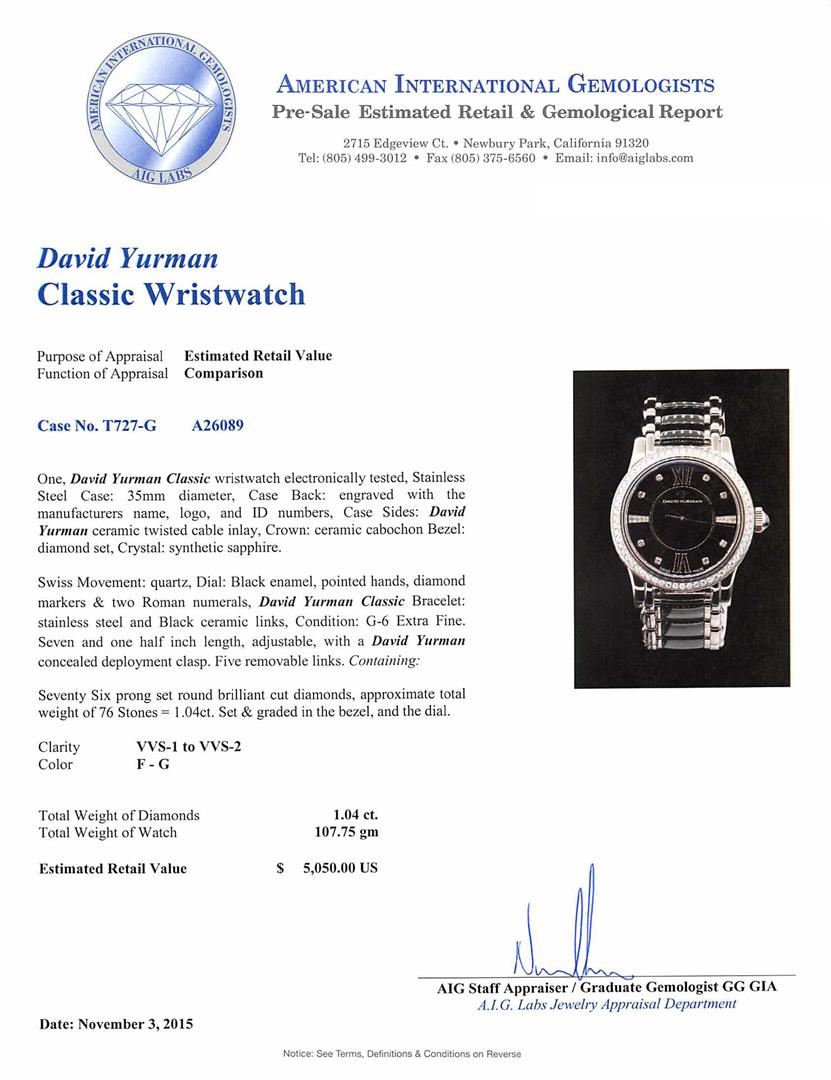 One, David Yurman Classic wristwatch electronically tested, Stainless Steel Case: 35mm diameter, Case Back: engraved with the manufactures name, logo, and ID numbers, Case Sides: David Yurman ceramic twisted cable inlay, Crown: ceramic cabochon Bezel: diamond set, Crystal: synthetic sapphire. Swiss Movement: quartz, Dial: Black enamel, pointed hands, diamond markers & two Roman Numerals, David Yurman Classic Bracelet: stainless steel and Black ceramic links, Condition: G-6 Extra Fine. Seven and one half inch length, adjustable, with a David Yurman concealed deployment clasp. Five removable links. Containing: Seventy Six prong set round brilliant cut diamonds, approximate total weight of 76 Stones = 1.04ct. Set & graded in the bezel, and the dial. Clarity: VVS-1 to VVS-2. Color: F - G. Total Weight of Diamonds 1.04ct. Total Weight of Watch: 107.75gm. AIG Appraised at $5,050.00.