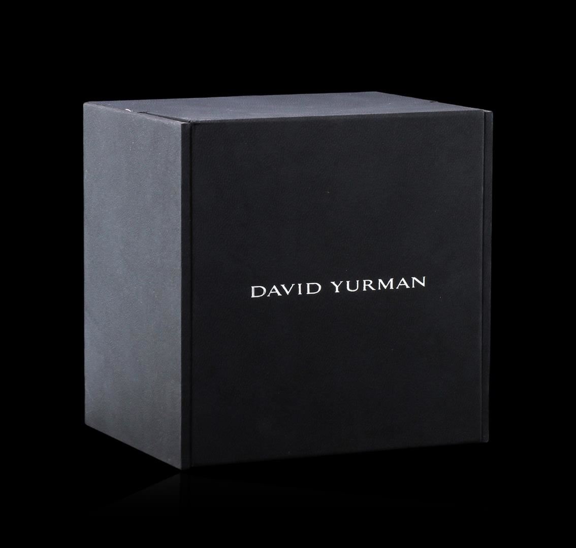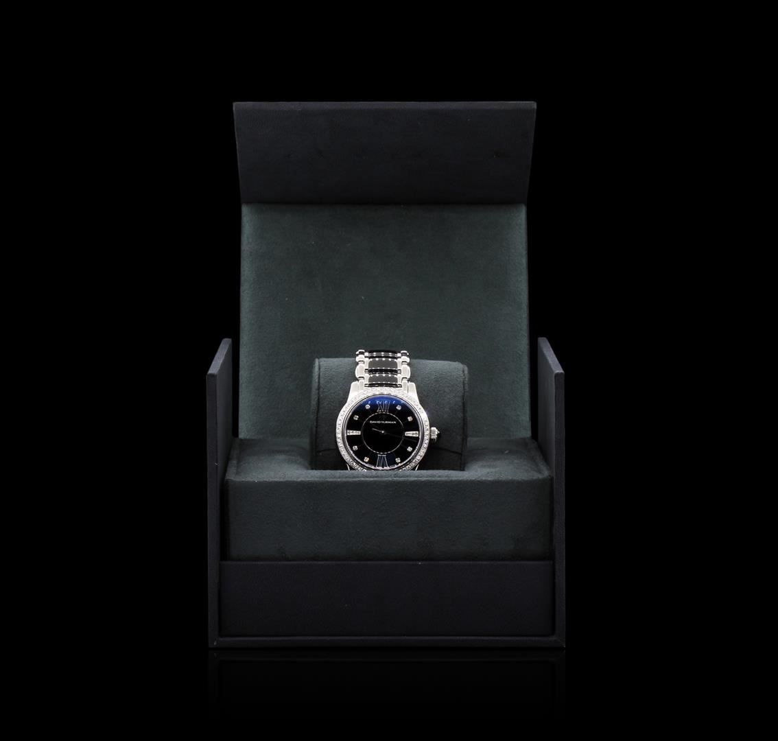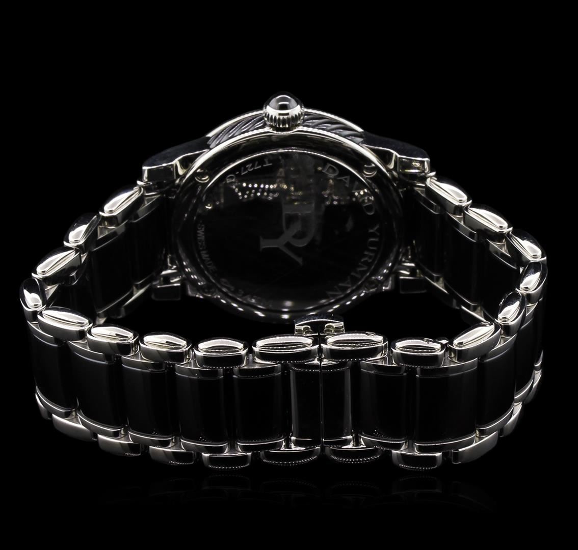 One, David Yurman Classic wristwatch electronically tested, Stainless Steel Case: 35mm diameter, Case Back: engraved with the manufactures name, logo, and ID numbers, Case Sides: David Yurman ceramic twisted cable inlay, Crown: ceramic cabochon Bezel: diamond set, Crystal: synthetic sapphire. Swiss Movement: quartz, Dial: Black enamel, pointed hands, diamond markers & two Roman Numerals, David Yurman Classic Bracelet: stainless steel and Black ceramic links, Condition: G-6 Extra Fine. Seven and one half inch length, adjustable, with a David Yurman concealed deployment clasp. Five removable links. Containing: Seventy Six prong set round brilliant cut diamonds, approximate total weight of 76 Stones = 1.04ct. Set & graded in the bezel, and the dial. Clarity: VVS-1 to VVS-2. Color: F - G. Total Weight of Diamonds 1.04ct. Total Weight of Watch: 107.75gm. AIG Appraised at $5,050.00.