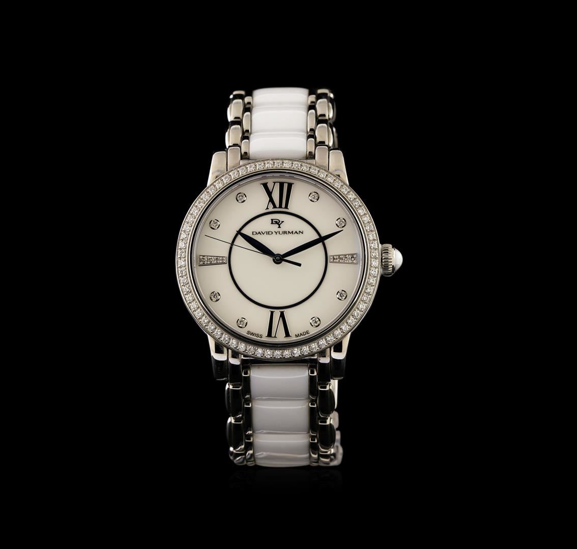 One, David Yurman Classic Diamond wristwatch electronically tested, Stainless Steel Case: 38mm diameter, Case Back: engraved with the manufacturers name, logo, and ID numbers, Case Sides: David Yurman Signature ceramic twisted cable inlay, Crown: ceramic cabochon Bezel: diamond set, Crystal: synthetic sapphire. Swiss Movement: quartz, Dial: White color, pointed hands, diamond markers & two Roman numerals, David Yurman Classic Bracelet: stainless steel and White ceramic links, Condition: G-6 Extra Fine. Seven and one half inch length, adjustable, with a David Yurman concealed deployment clasp. Six removable links. Containing: Approximately Eighty Two prong set round brilliant cut diamonds, approximate total weight of 82 Stones = 1.10ct. Set & graded in the bezel, and the dial. Clarity: VVS-1 to VVS-2 Color F - G. Total Weight of Diamonds 1.10ct. Total Weight of Watch 116.22gm. AIG Appraised at $5,250.00.