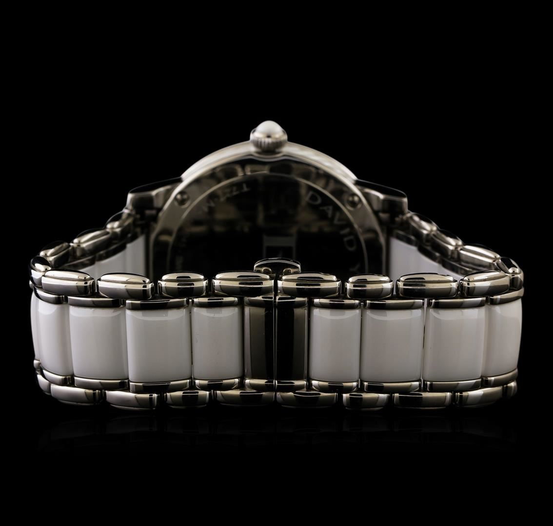 One, David Yurman Classic Diamond wristwatch electronically tested, Stainless Steel Case: 38mm diameter, Case Back: engraved with the manufacturers name, logo, and ID numbers, Case Sides: David Yurman Signature ceramic twisted cable inlay, Crown: ceramic cabochon Bezel: diamond set, Crystal: synthetic sapphire. Swiss Movement: quartz, Dial: White color, pointed hands, diamond markers & two Roman numerals, David Yurman Classic Bracelet: stainless steel and White ceramic links, Condition: G-6 Extra Fine. Seven and one half inch length, adjustable, with a David Yurman concealed deployment clasp. Six removable links. Containing: Approximately Eighty Two prong set round brilliant cut diamonds, approximate total weight of 82 Stones = 1.10ct. Set & graded in the bezel, and the dial. Clarity: VVS-1 to VVS-2 Color F - G. Total Weight of Diamonds 1.10ct. Total Weight of Watch 116.22gm. AIG Appraised at $5,250.00.