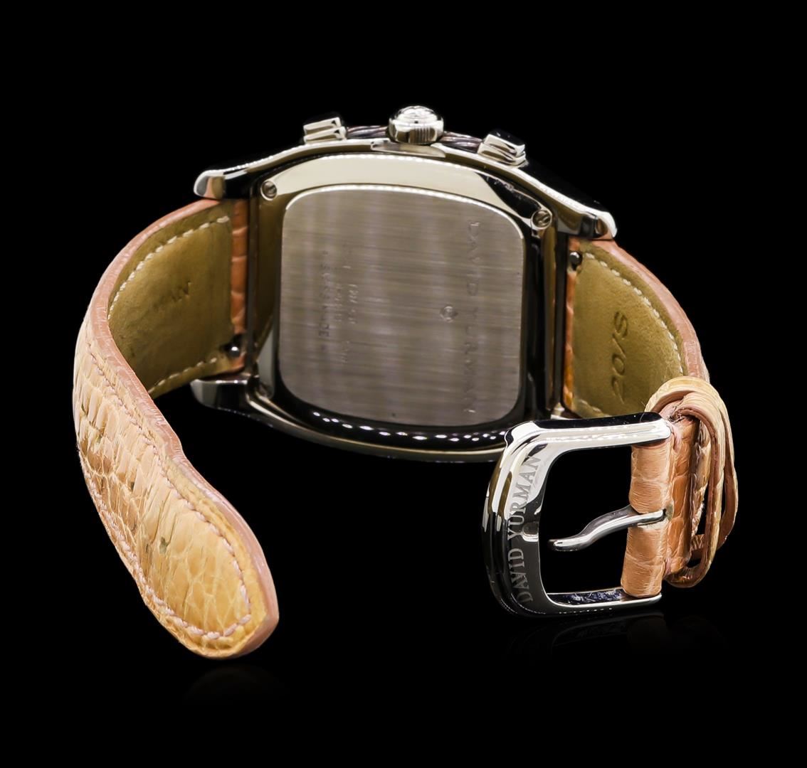 One, David Yurman Thoroughbred Chronograph wristwatch electronically tested, Stainless Steel Case: 45 x 36mm, Case Back: engraved with the manufacturers name, logo, ID numbers and information, Case Sides: David Yurman signature stainless steel twisted cable inlay, Bezel: polished, Logo'd Crown, Crystal: synthetic sapphire. Swiss Movement: quartz, Dial: mother of pearl, pointed hands, & diamond markers, Chronograph Functions: Silver rimmed Pink sub dials for; hours, minutes, and seconds, Date Window: 4 o'clock position, Bracelet: saddle stitched leather strap, Condition: G-6 Extra Fine. Seven and one half inch length, adjustable, with a David Yurman buckle. Total Weight of Watch 154.01gm. AIG Appraised at $2,880.00.