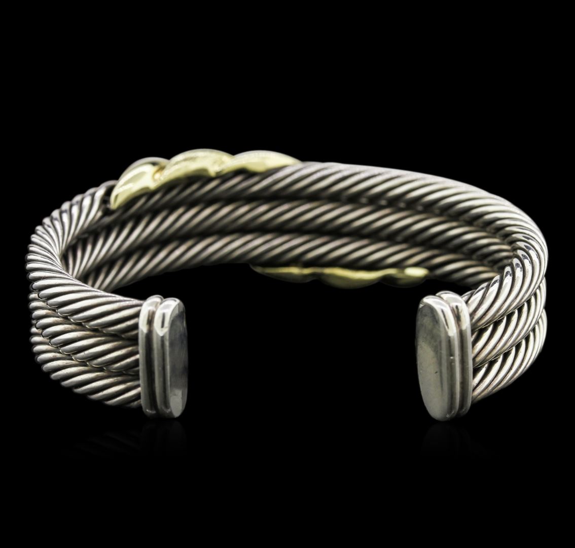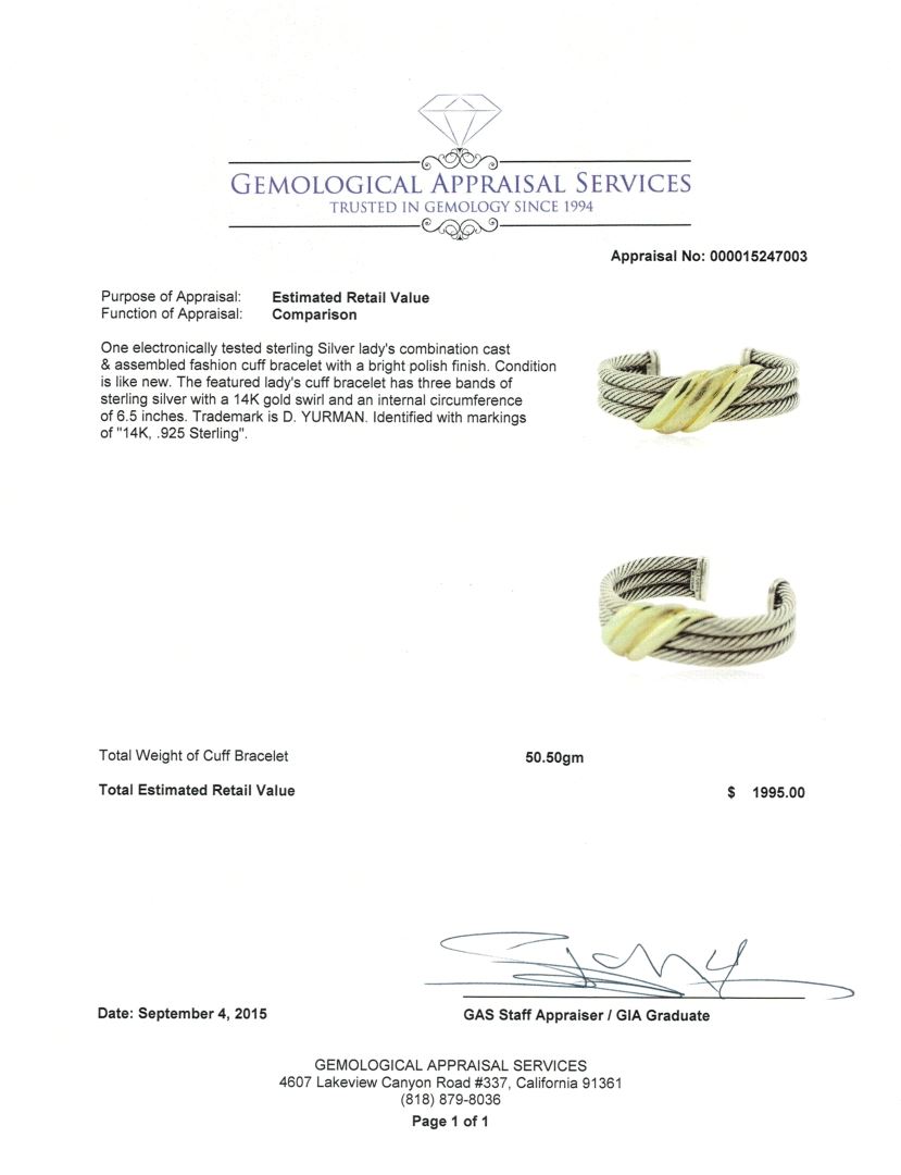 One electronically tested sterling Silver lady's combination cast & assembled fashion cuff bracelet with a bright polish finish. The featured lady's cuff bracelet has three bands of sterling silver with a 14K gold swirl and an internal circumference of 6.5 inches. Trademark is D. YURMAN. Identified with markings of "14K, .925 Sterling". Condition is like new. Total Weight of Cuff Bracelet 50.50gm. GAS Appraised at $1,995.00.