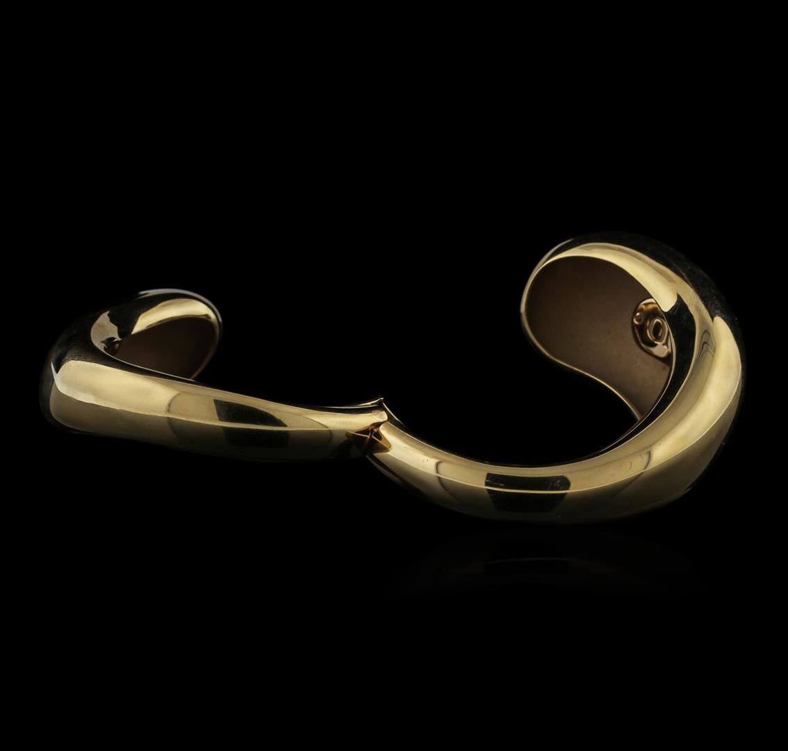 One electronically tested 18KT rose gold ladies cast & assembled cuff bracelet with a bright polish finish. Six inch wearable length cuff bracelet features two opposing billowing tear drop shapes, supported by a hinged shoulder. The bracelet is from de Grisogono's Contrario Collection. Stamped B24652. Trademark is de GRISOGONO. Identified with markings of "750". Condition is good. Total Weight of Cuff Bracelet: 123.90 gm. AIG Appraised at $43,390.00.