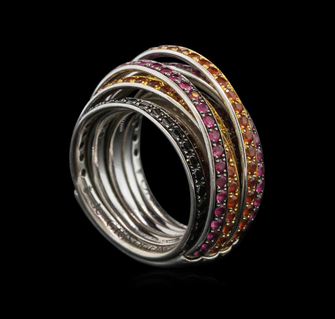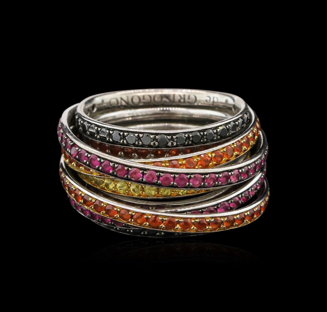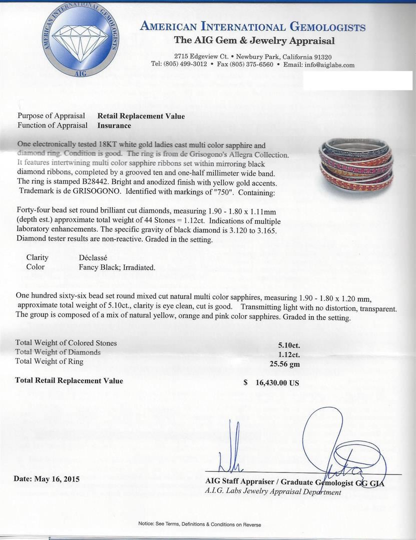 One electronically tested 18KT white gold ladies cast multi color sapphire and diamond ring. Condition is good. The ring is from de Grisogono's Allegra Collection. It features intertwining multi color sapphire ribbons set within mirroring black diamond ribbons, completed by a grooved ten and one-half millimeter wide band. The ring is stamped B28442. Bright and anodized finish with yellow gold accents. Trademark is de GRISOGONO. Identified with markings of "750". Containing: Forty-four bead set round brilliant cut diamonds, measuring 1.90 - 1.80 x 1.11mm (depth est.) approximate total weight of 44 stones = 1.12ct. Indications of multiple laboratory enhancements. The specific gravity of black diamond is 3.120 to 3.165. Diamond tester results are non-reactive. Graded in the setting. Clarity: Declasse. Color: Fancy Black; Irradiated. One hundred sixty-six bead set round mixed cut natural multi color sapphires, measuring 1.90 - 1.80 x 1.20 mm, approximate total weight of 5.10ct., clarity is eye clean, cut is good. Transmitting light with no distortion, transparent. The group is composed of a mix of natural yellow, orange and pink color sapphires. Graded in the setting. Total Weight of Colored Stones: 5.10ct. Total Weight of Diamonds: 1.12ct. Total Weight of Ring: 25.56 gm. AIG Appraised at $16,430.00.