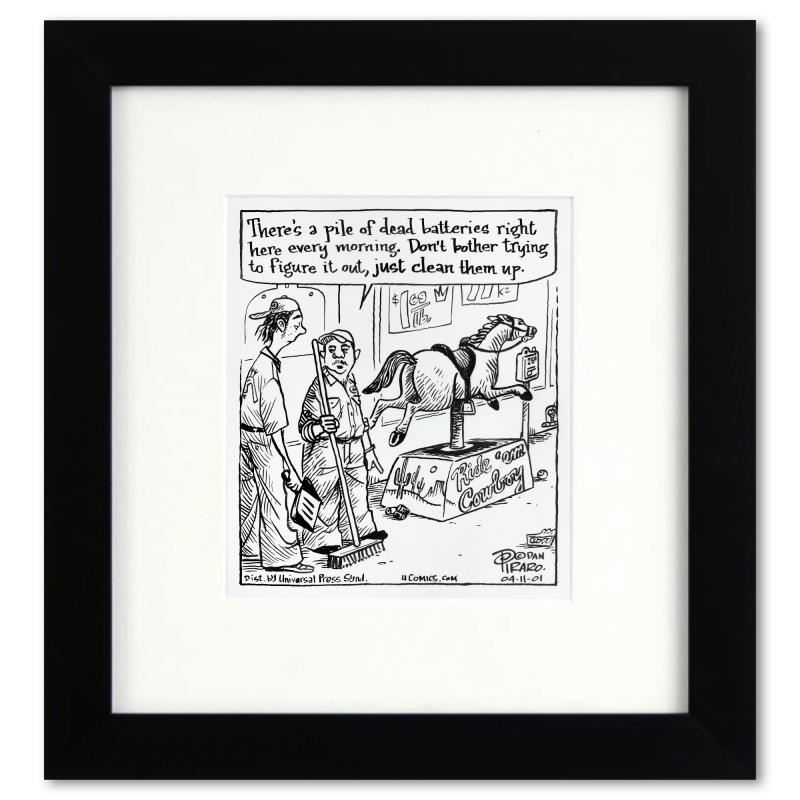 Dead Batteries by Bizarro Original. Please see photos and description for all available information. Enter a surreal and satirical world of twisted imagination and award winning creativity. "Dead Batteries" is an original pen & ink drawing on paper by Dan Piraro, creator of the critically acclaimed and award winning comic strip, Bizarro. This piece is hand signed, comes custom framed and includes a letter of authenticity. Measures approximately 12" x 11" (frame), 7" x 6" (image).This item requires special handling and may have a longer than usual turnaround.
