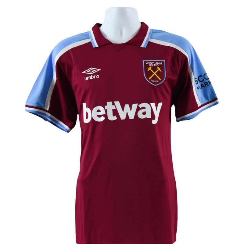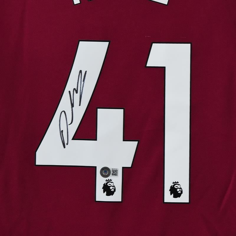 Declan Rice West Ham Jersey by Rice, Declan. This is a replica West Ham United F.C. soccer jersey autographed by Declan Rice. This piece is presented with a Certificate of Authenticity from Beckett with a QR code and certification number. Measures approx. 30" x 28" (jersey).