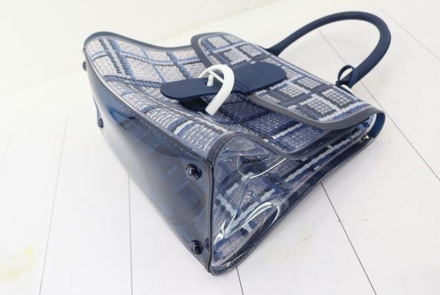 Delvaux Brilliant The Dreamer satchel bag is crafted of fine durable vinyl in white and navy in Gingham pattern. The bag features a blue top handle, an optional shoulder strap and white hardware. The top flap opens with a plastic strap closure to a matchi