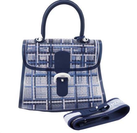 One Delvaux Navy Blue Gingham Vinyl PVC Brillant The Dreamer MM Satchel Bag. Item is sold AS-IS. All available information is listed in the description and shown in the photo. Delvaux Brilliant The Dreamer satchel bag is crafted of fine durable vinyl in white and navy in Gingham pattern. The bag features a blue top handle, an optional shoulder strap and white hardware. The top flap opens with a plastic strap closure to a matching interior. Base Length: 11.25 in Height: 8.75 in Width: 5.75 in Handle Drop: 4.5 in Shoulder Drop: 15.75 in