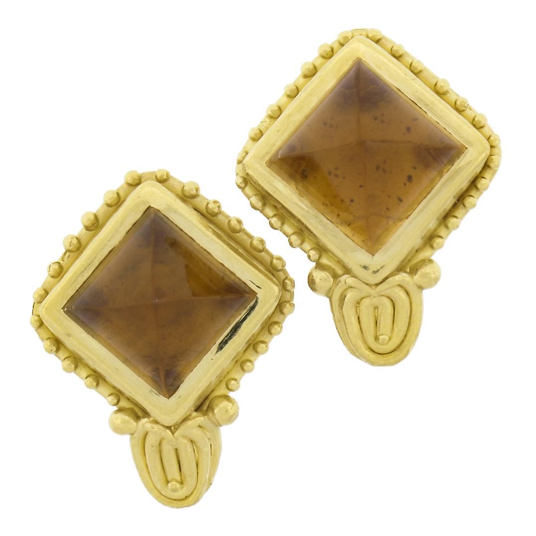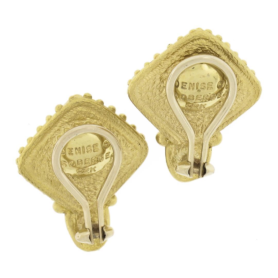 A solid 22k yellow gold clip on earrings bu Denise Roberge, with 2 sugarloaf cabochon cut natrual citrines (13.4x13.4mm each). The earrings measure approximately 23.3x18.3mm and weigh a total of 18.58 grams.