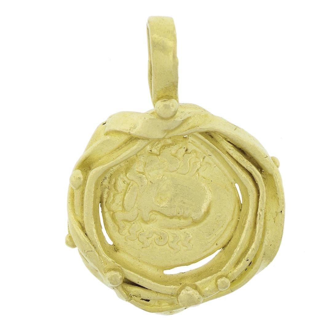 A solid 22k yellow gold coing pendant by Denise Roberge. The pendant weighs a total of 28.93 grams, measures 40x29.6mm including the bail, and the inside of the bail measures 9.7x6.2mm.