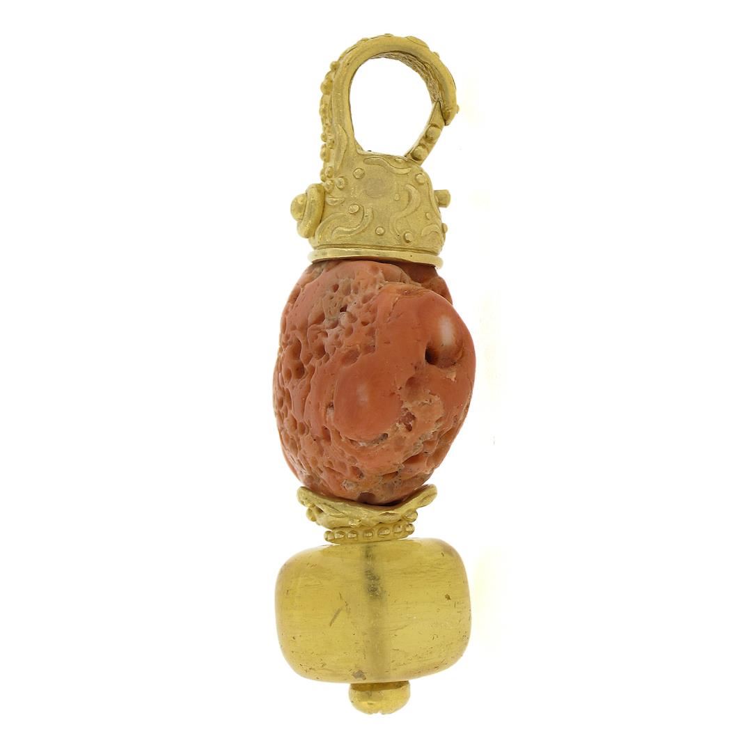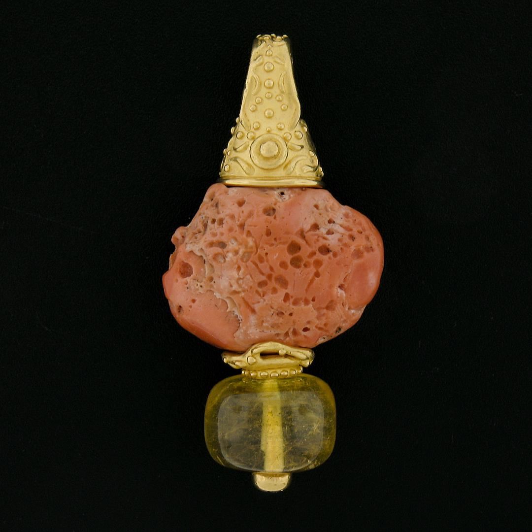 A solid 22k yellow gold enhancer pendant by Denise Roberge, with 1 natural coral (19.2x28.1mm), and 1 rondelle shape natural citrine (16.7mm). The pendant weighs a total of 34.86 grams, measures 58x28mm including the bail.