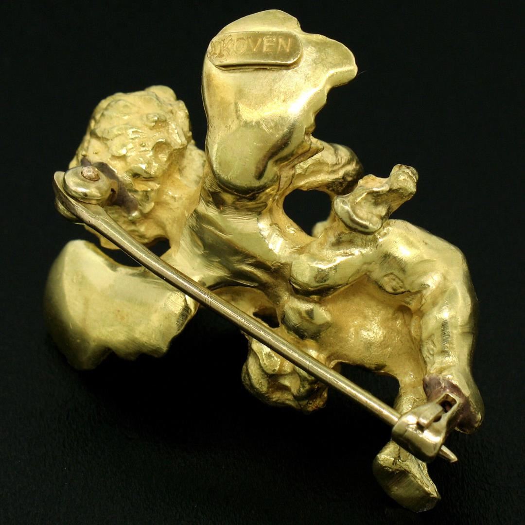 An estate solid 18k yellow gold 3D cherub angel brooch by Koven. Measures 31.50x25.80mm and weighs a total of 20.08 grams.