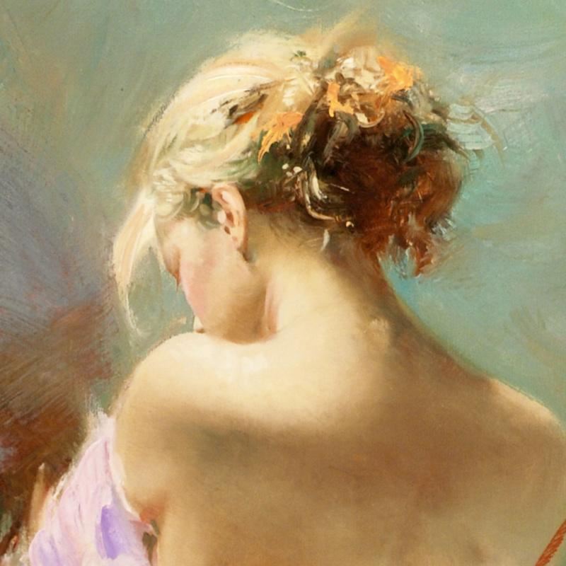 Pino's portraits allow glimpses into intensely personal, intimate spaces, conveying emotion through rich, warm color and sensual brushwork. "Desire" is a limited edition giclee on canvas that has been hand-embellished by Pino himself, AP numbered and hand signed by Pino (1939-2010). Includes Certificate of Authenticity! Measures approx. 12" x 10" (image).