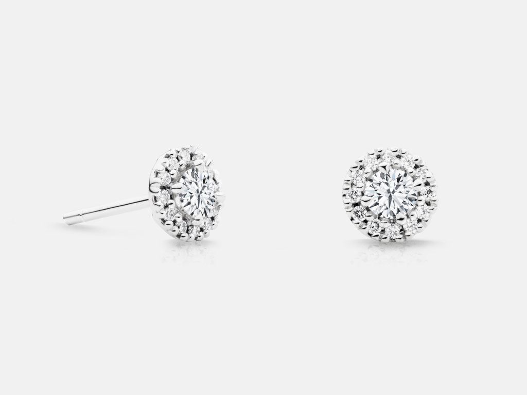 14K white gold halo earrings each featuring .34 ct round brilliant centers set in .10ct halos. All diamonds are F-H, SI-I1.