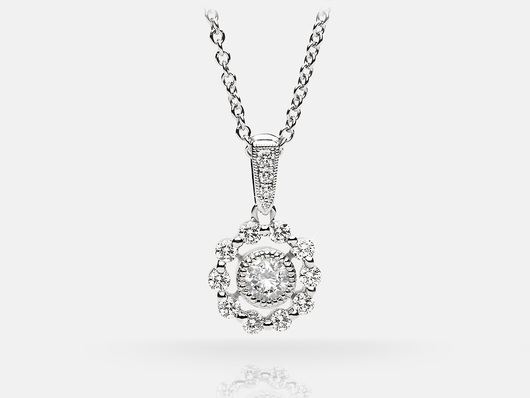 14K White gold flower pendant w/ chain featuring a .51 cts G-H SI center set w/ 10-.06 cts.
