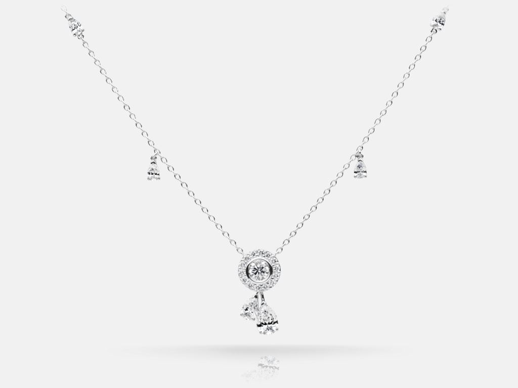 18K WG Pear shape dangle necklace. Set w/14 side diamonds G-H Color SI2 clarity (0.29cts); 4 G-VS2 Pear shape diamonds (0.60cts). Featuring 1x 0.75 H-VS2 Pear Shape; 1x 0.38 G-VS2 Pear Shape & a 0.51 H-SI-1 quality RB center diamond.