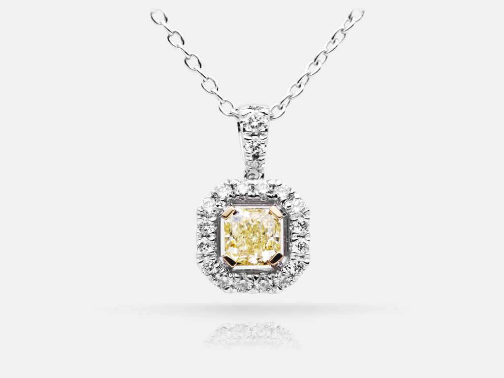 18K TT Halo style pendant: featuring 0.63Fany Yellow Radiant cut set w/19 0.40 cts G-H SI2 quality side diamonds.