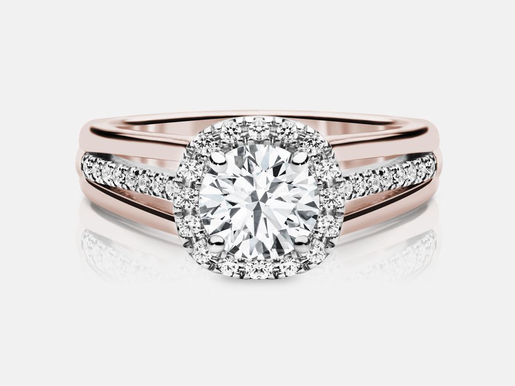 14K white gold engagement ring. Featuring a 0.46cts H SI1 GIA round brilliant. 46 - .003 cst G/H SI1/2 diamonds make up the halo diamonds, diamonds under the center setting and diamonds in the shank.