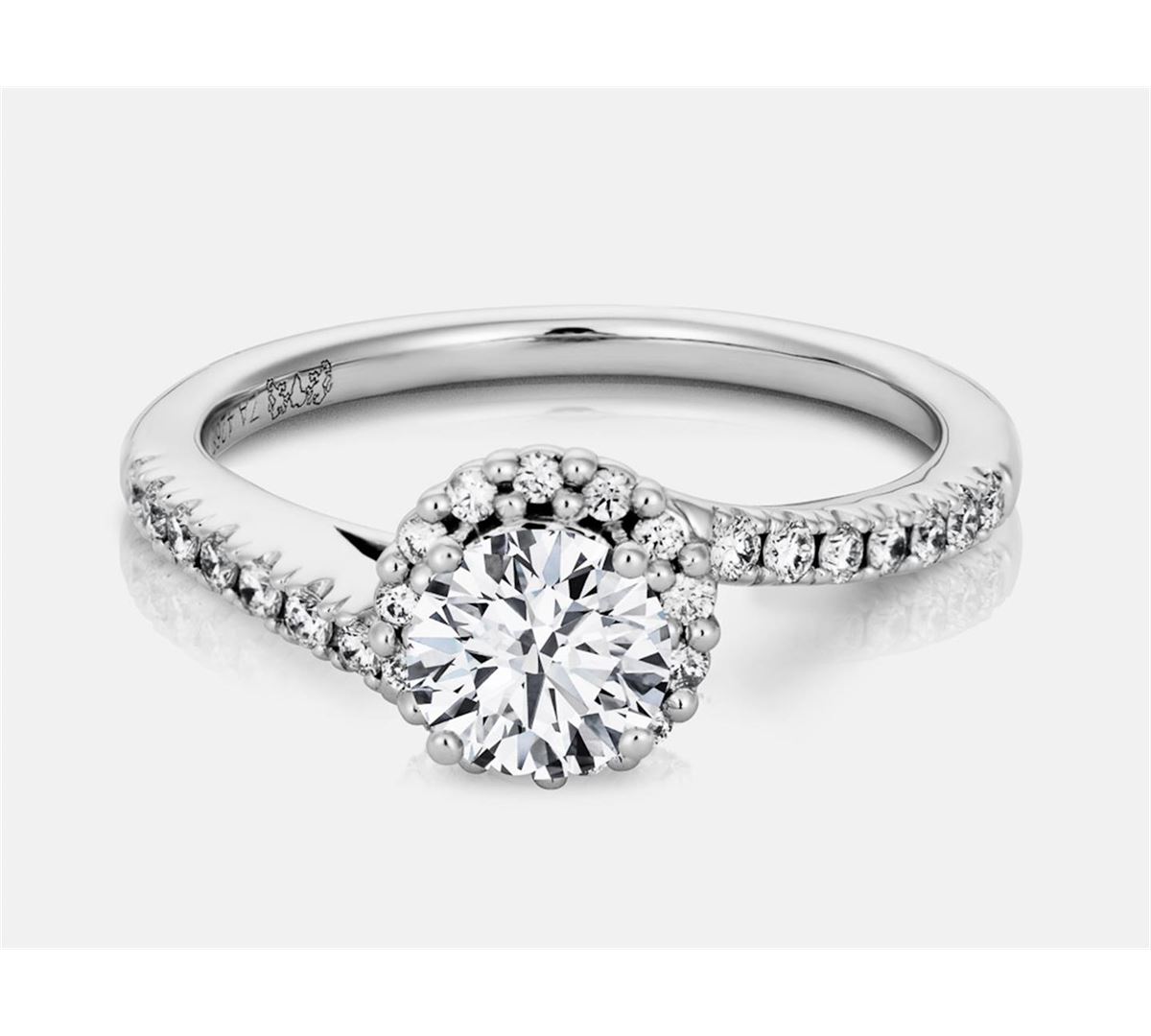 14K White gold engagement ring w/ a halo and diamonds in the shank 1/2. This ring features a 0.43 cts F VS2 GIA round brilliant. 27- 0.025 cts, F VS2 diamonds make up the halo and shank.