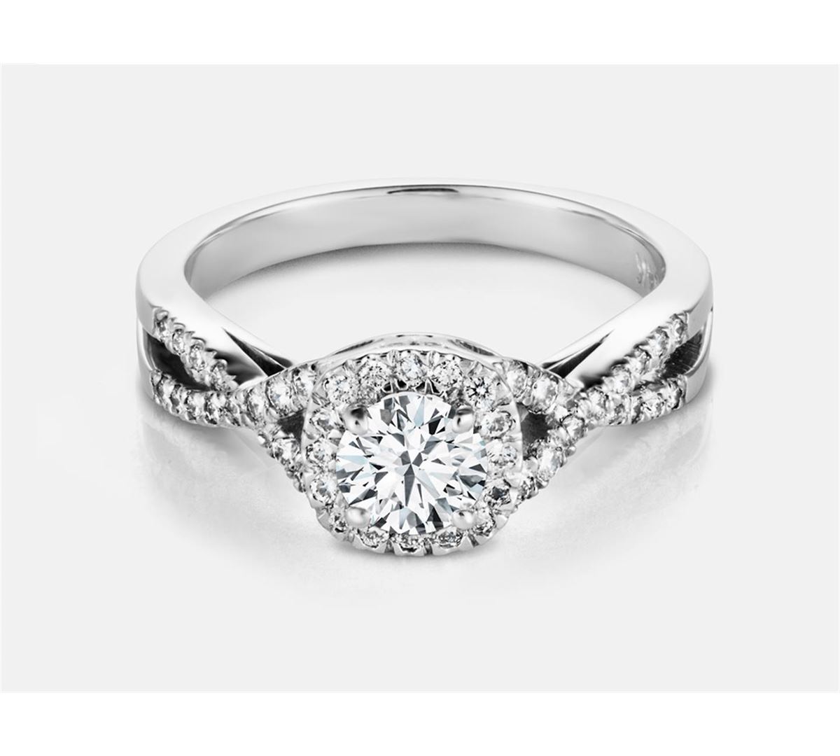 14K White gold halo engagement ring w/ diamonds in the shank. This ring features a 0.40 I VSI GIA round brilliant set with 44- 0.005 cts GHI VS/SI diamonds.