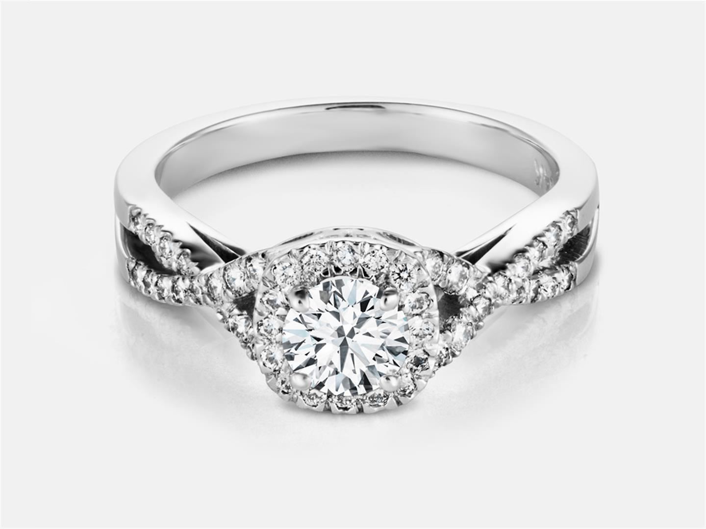14K White gold halo engagement ring w/ diamonds in the shank. This ring features a 0.40 I VSI GIA round brilliant set with 44- 0.005 cts GHI VS/SI diamonds.
