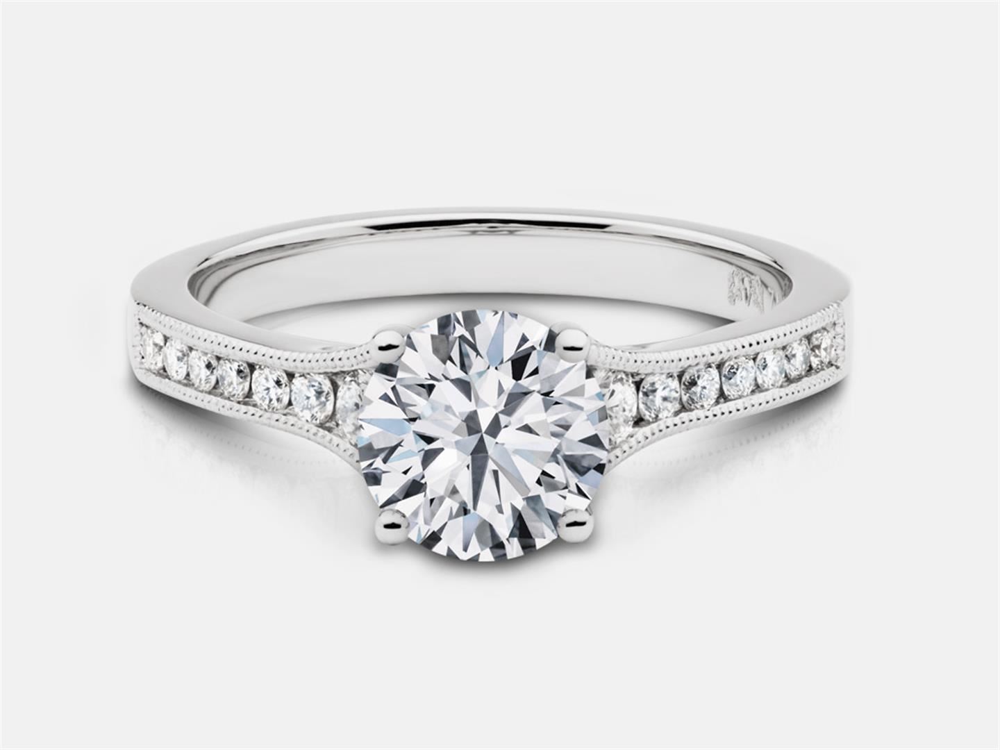 14K White gold engagement ring w/ diamonds in the shank. Featuring a 0.30 cts F VS2 GIA round brilliant set w/ 14- 0.018 cts F-H VS/SI Diamonds in the shank.