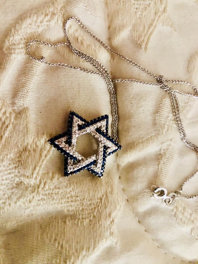 A custom designed Star of David on a 14k white gold backing w/ white gold 16" chain .Comprised of 64 small diamonds & 64 small sapphires .The star measures 1.25" across . 8.6 grams total weight