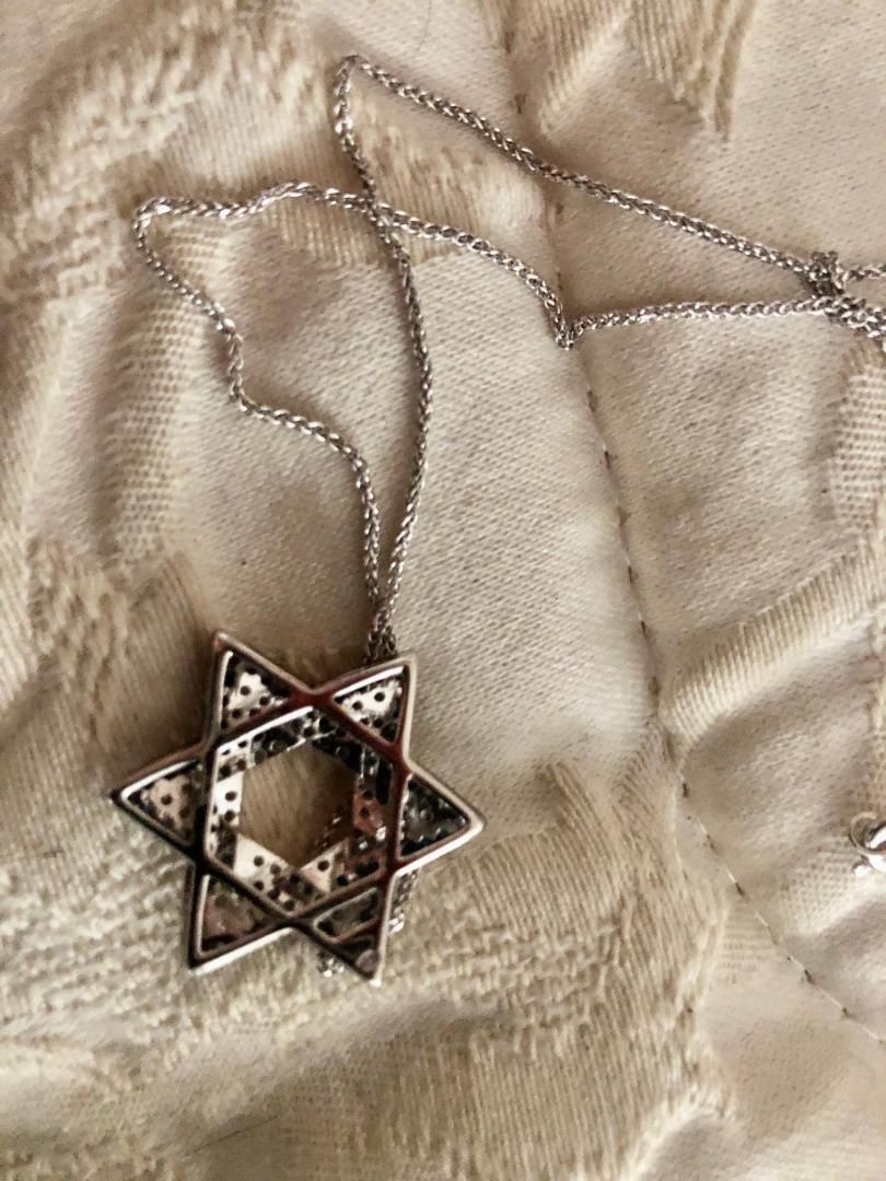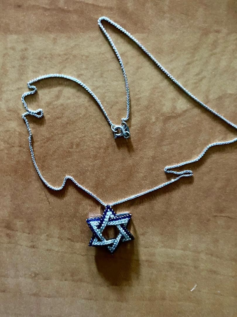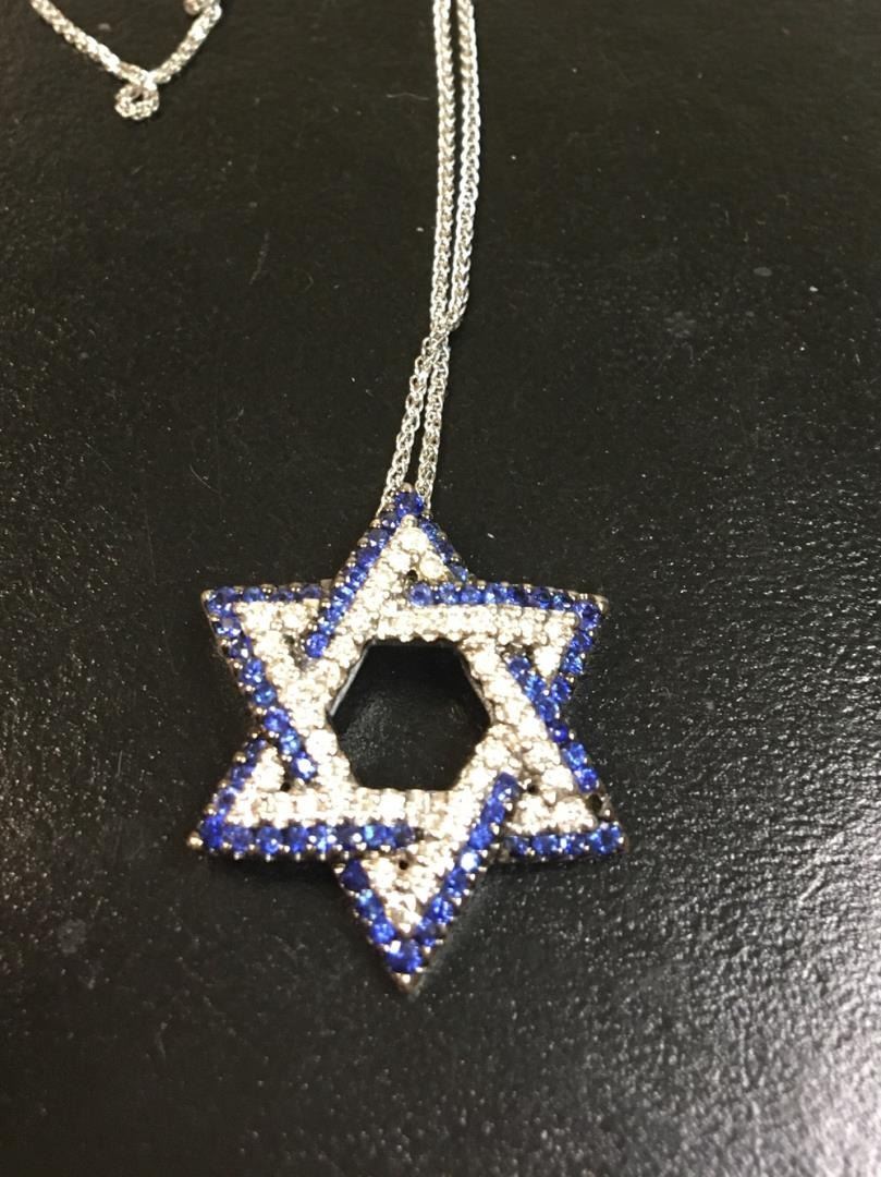 A custom designed Star of David on a 14k white gold backing w/ white gold 16" chain. Comprised of 64 small diamonds & 64 small sapphires. The star measures 1.25" across. 8.6 grams total weight
