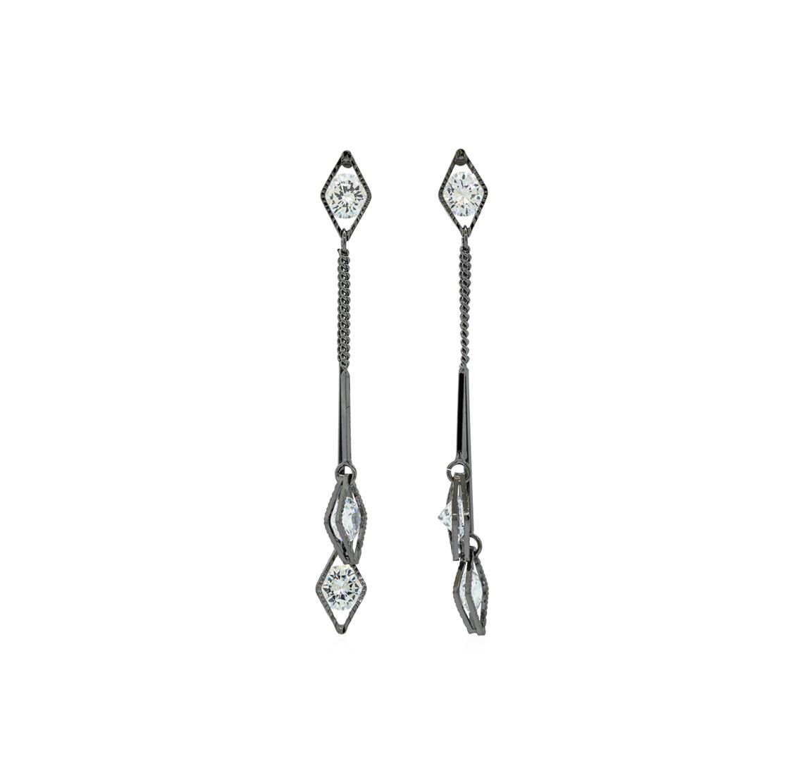 High end designer jewelry. Diamond Shaped Detail Earrings - Black Rhodium Plated. Blk Rhodium Plated Post Set. Clear/ Black. 2.25"Dangle.