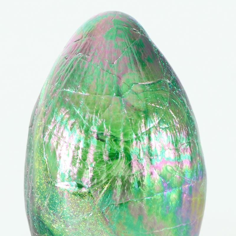 "Dichroic Egg - Terra" is a hand blown glass egg sculpture (second) from Glass Eye Studios. This piece contains ash from the 1980 volcanic eruption of Mount St. Helens. As each piece is individually handcrafted, the pattern in the glass may vary slightly from the image shown. "Second" means very slightly imperfect, but still great quality. Measures approx. 2" x 2" x 3".