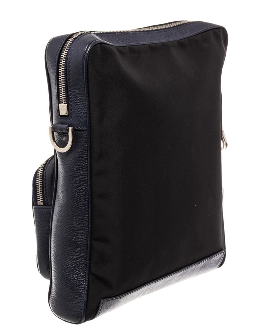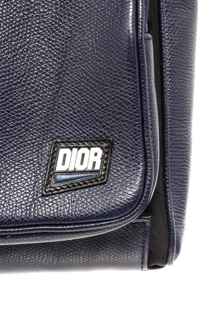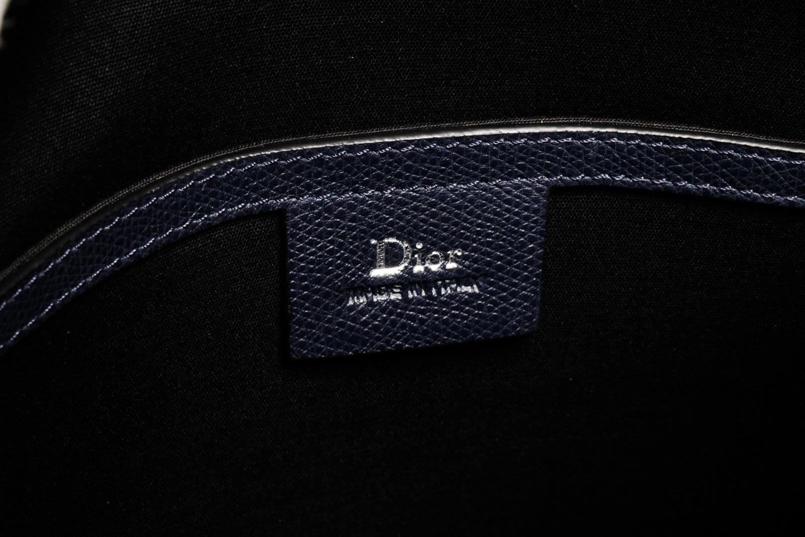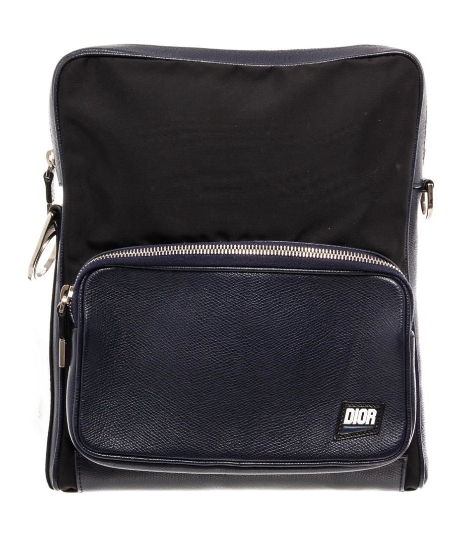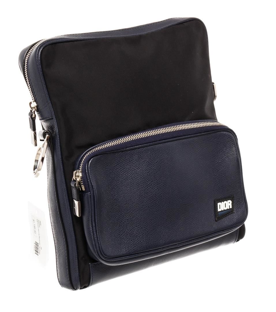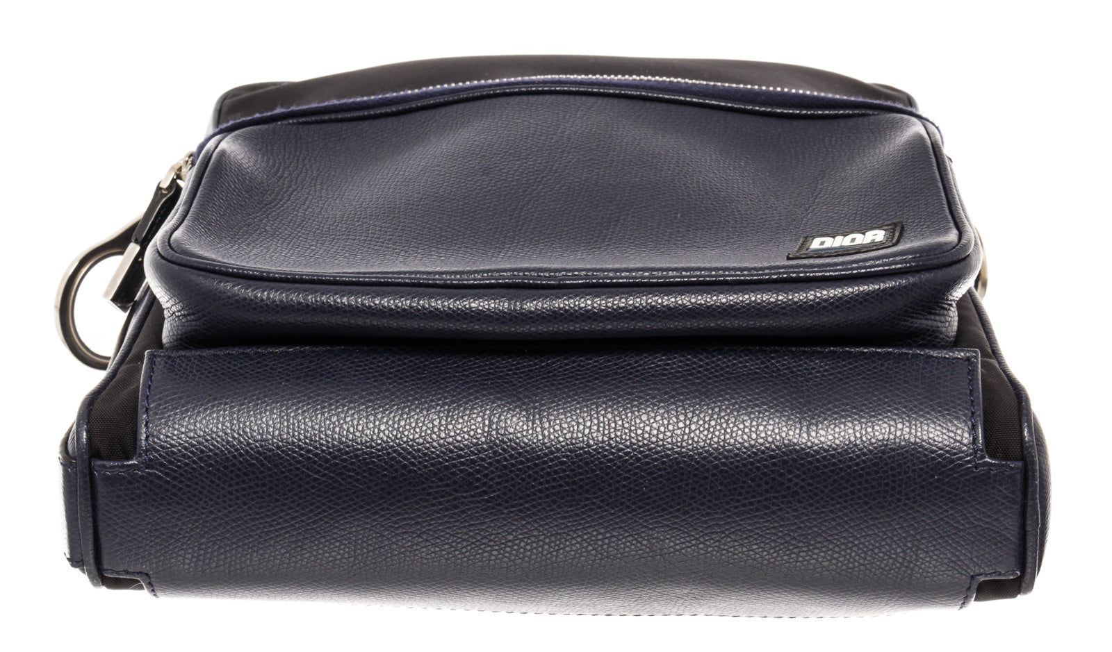 Black and blue leather Dior Homme messengers crossbody bag with silver-tone hardware, one zipper pocket at front, black adjustable straps, and black suede interior lining.