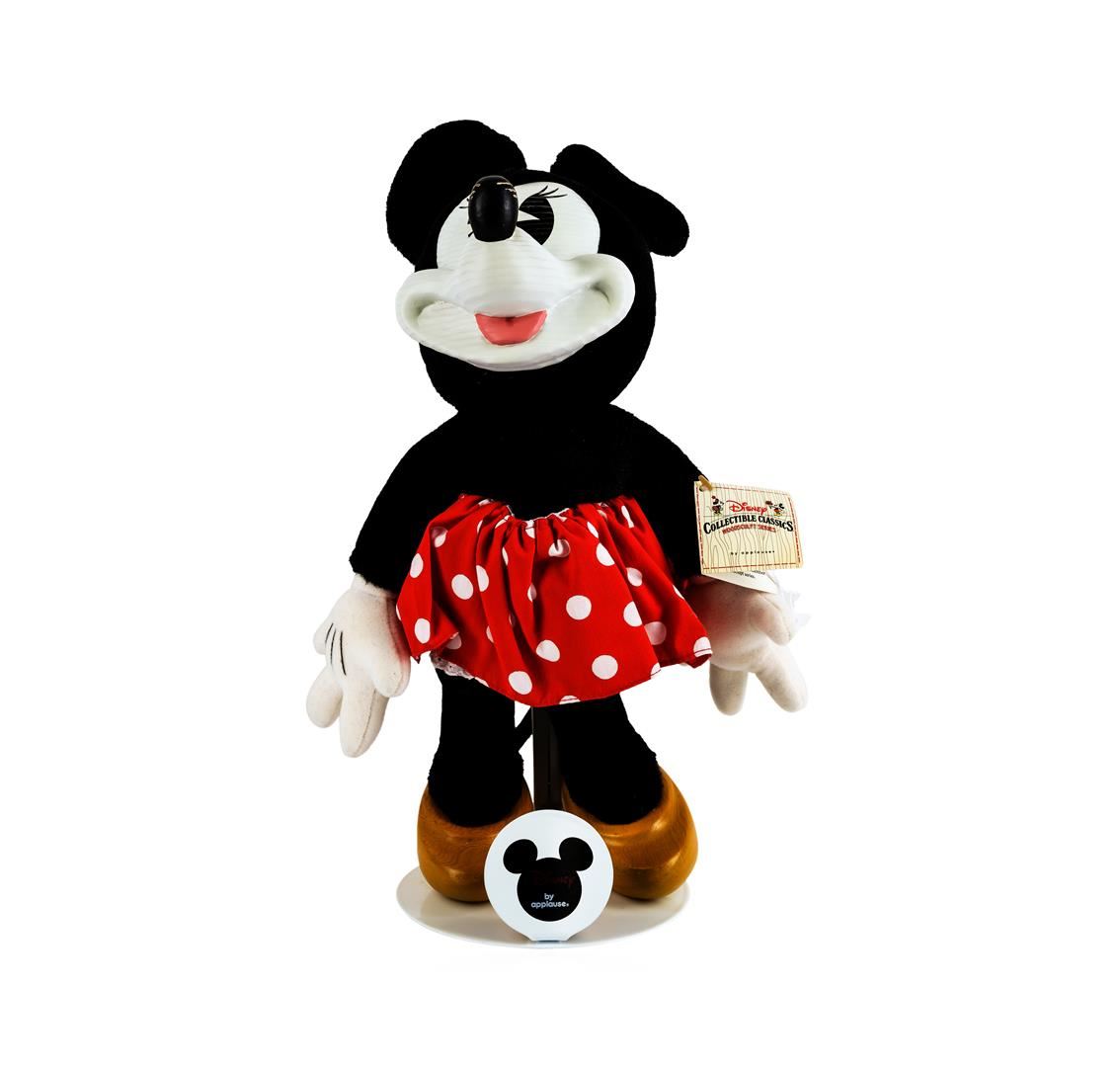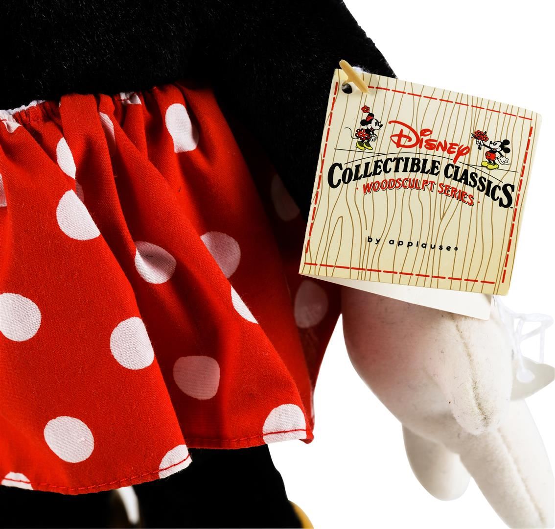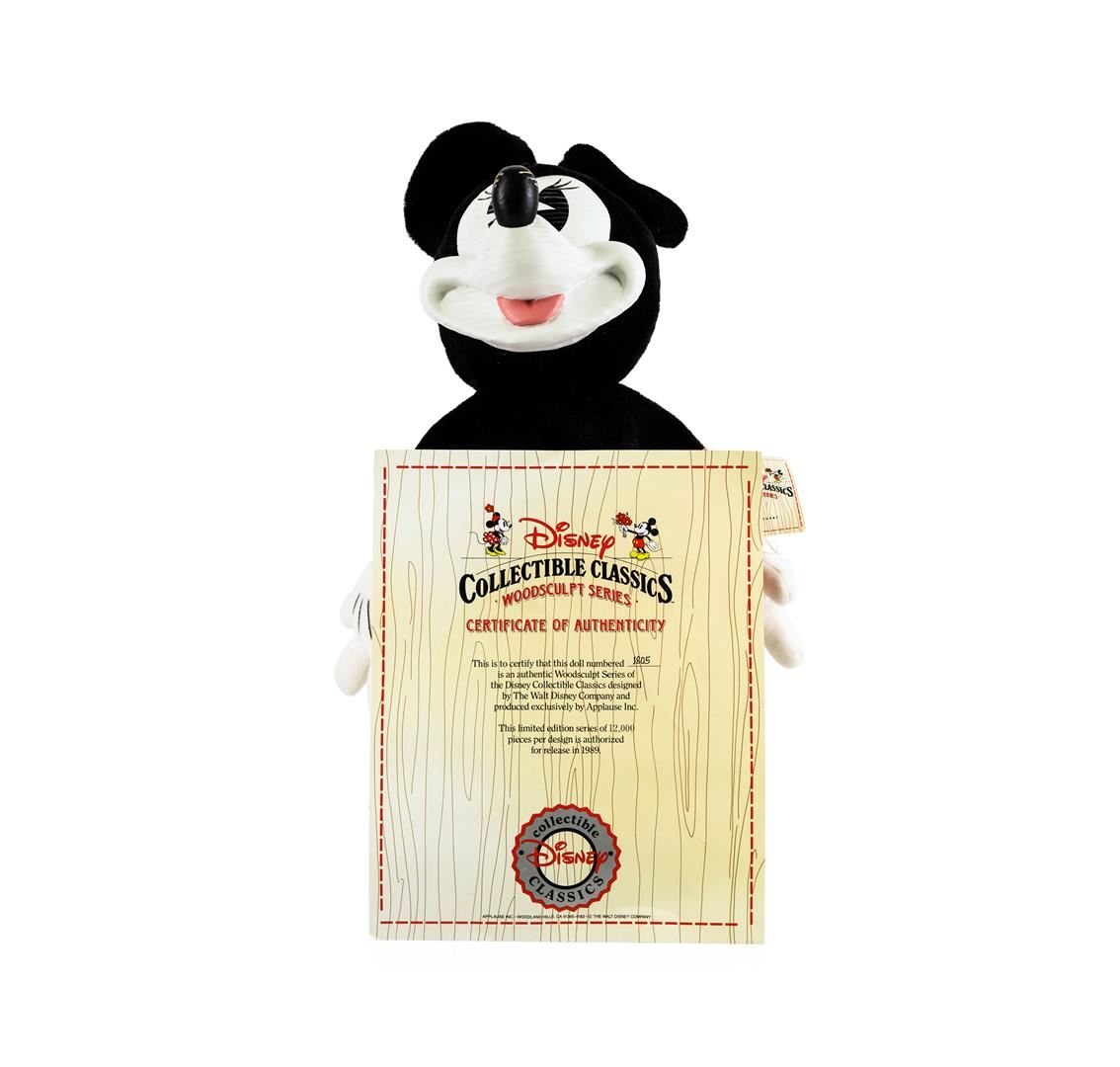 This is an Applause Brand Minnie Mouse doll 15" with Stand It is from the "Disney Collectible Classics Woodsculpt Series" done in 1989. This limited edition piece is numbered with Minnie Mouse being #1805 in a limited edition of 12,000. The original tags are still on the doll as well as she is on her original stand. Comes with the original Certificates of Authenticity.