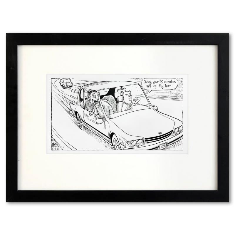 Enter a surreal and satirical world of twisted imagination and award winning creativity. "Dog Driver" is an original pen & ink drawing on paper by Dan Piraro, creator of the critically acclaimed and award winning comic strip, Bizarro. This piece is hand signed, comes custom framed and includes a letter of authenticity. Measures approximately 14" x 21" (frame), 7" x 13" (image).This item requires special handling and may have a longer than usual turnaround.