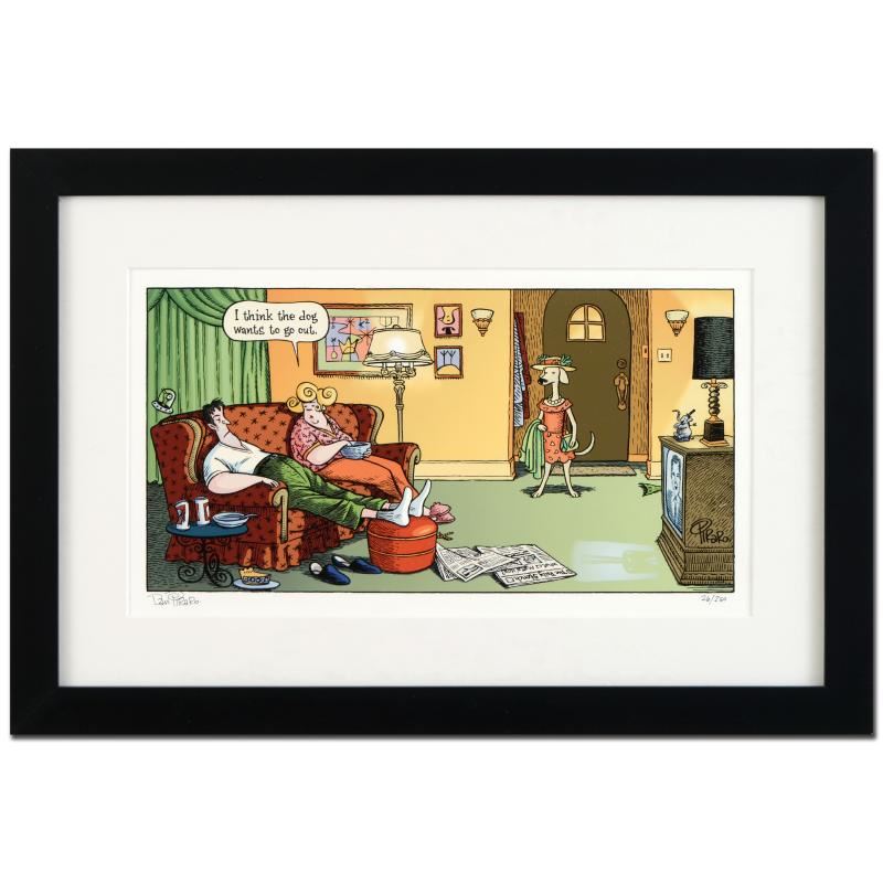 Enter a surreal and satirical world of twisted imagination and award winning creativity. "Dog Goes Out" is a limited edition giclee on paper by Dan Piraro, creator of the critically acclaimed and award winning comic strip, Bizarro! This piece is framed, numbered and hand signed by the artist! Includes Certificate of Authenticity! Measures approx. 22" x 15" (with frame), 15" x 8" (image).