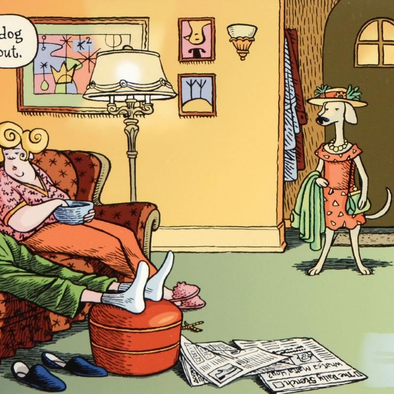 Enter a surreal and satirical world of twisted imagination and award winning creativity. "Dog Goes Out" is a limited edition giclee on paper by Dan Piraro, creator of the critically acclaimed and award winning comic strip, Bizarro! This piece is framed, numbered and hand signed by the artist! Includes Certificate of Authenticity! Measures approx. 22" x 15" (with frame), 15" x 8" (image).