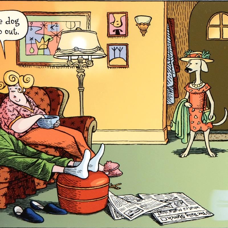 "Dog Goes Out" is a limited edition giclee on paper by Dan Piraro creator of the critically acclaimed and award winning comic strip Bizarro! This piece is numbered and hand signed by the artist and includes aletterof authenticity. Measures approximtely 8" x 15" (image).