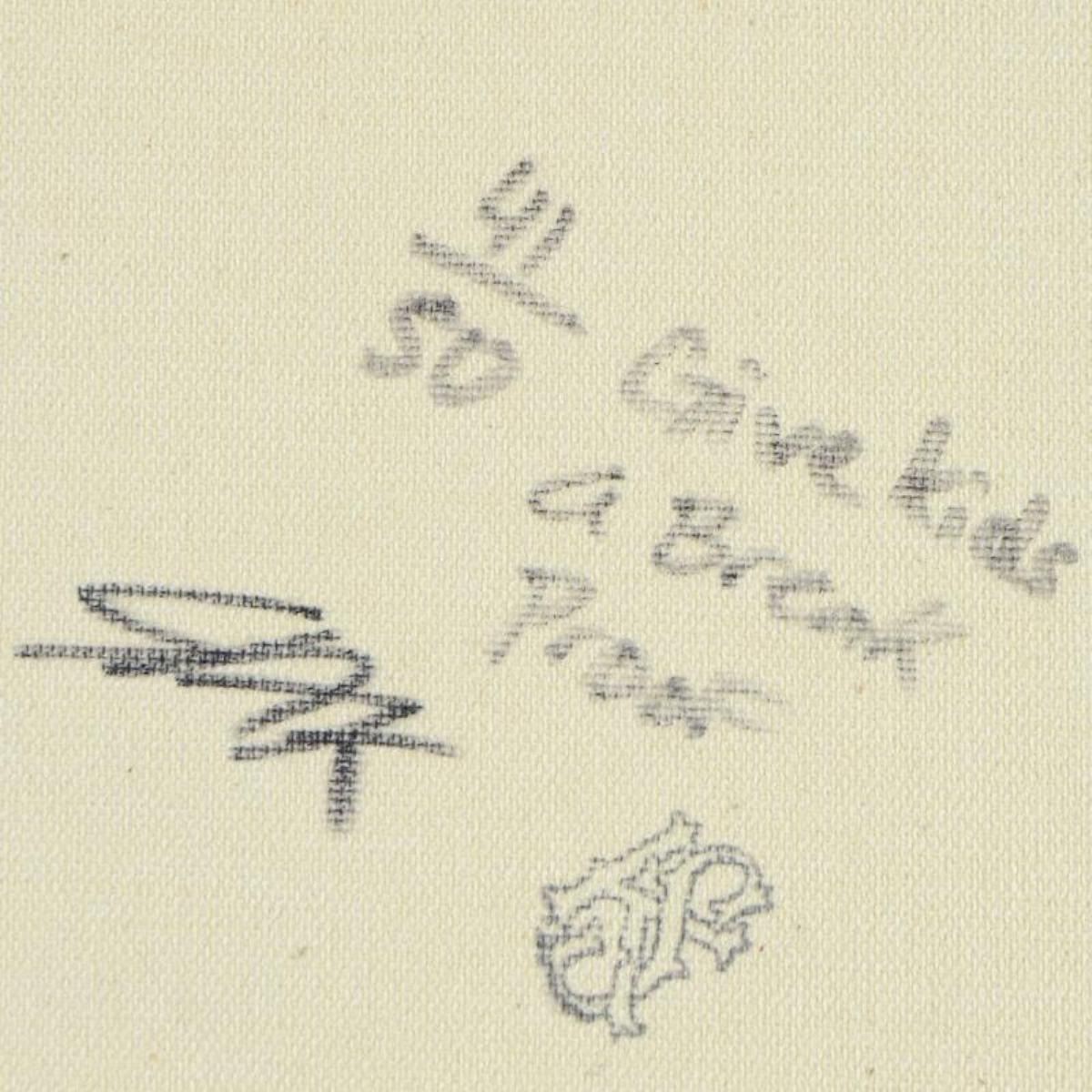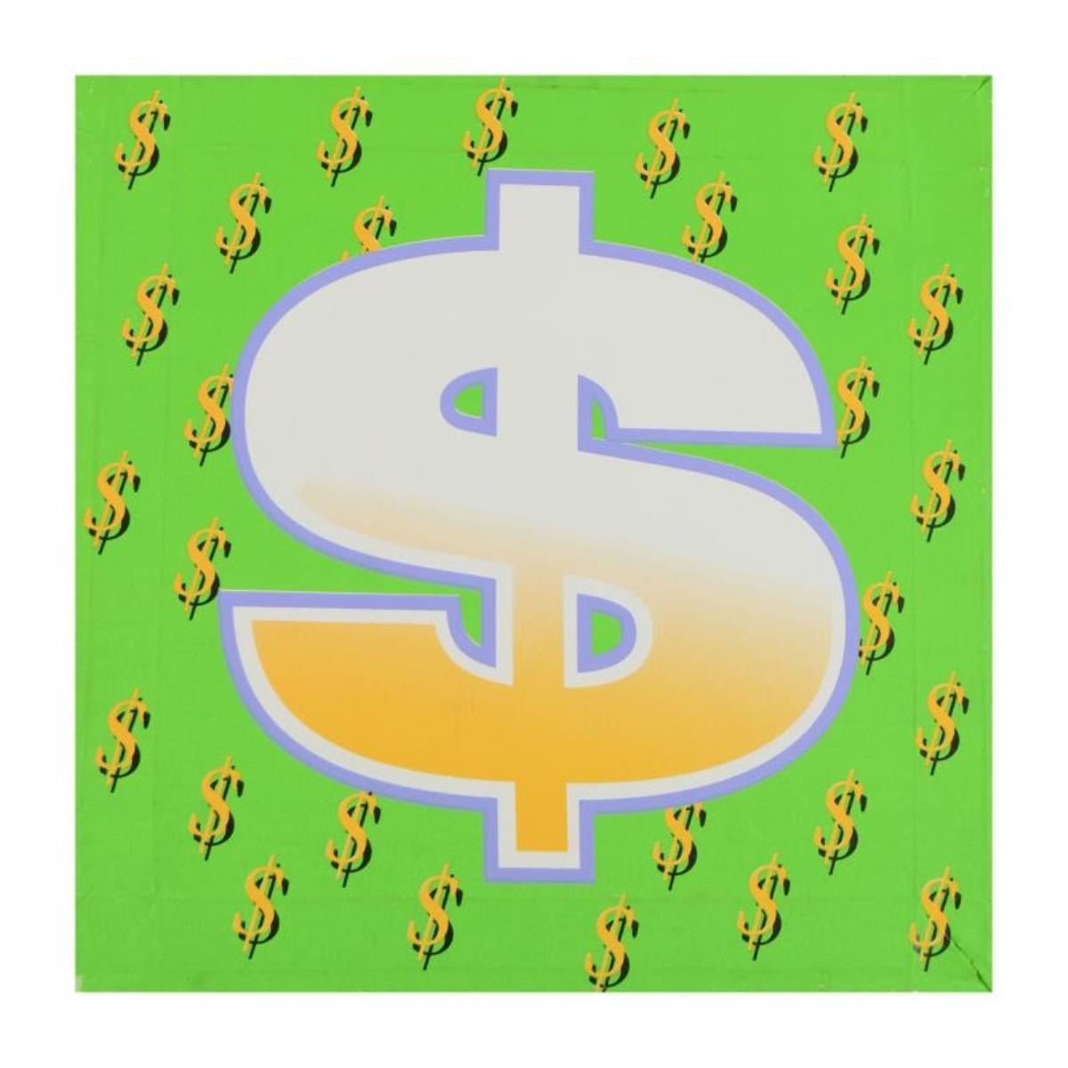 Dollar Sign (Green Bold) by Steve Kaufman (1960-2010). "Dollar Sign" is a limited edition hand pulled silkscreen on canvas by Andy Warhol protege Steve Kaufman (1960-2010). This piece is numbered 41/50 and hand signed inverso. Includes Certificate of authenticity. As is common with Kaufman's works, this piece may have perceived minor flaws, but is in overall good condition. Measures approx. 24" x 24" (image).